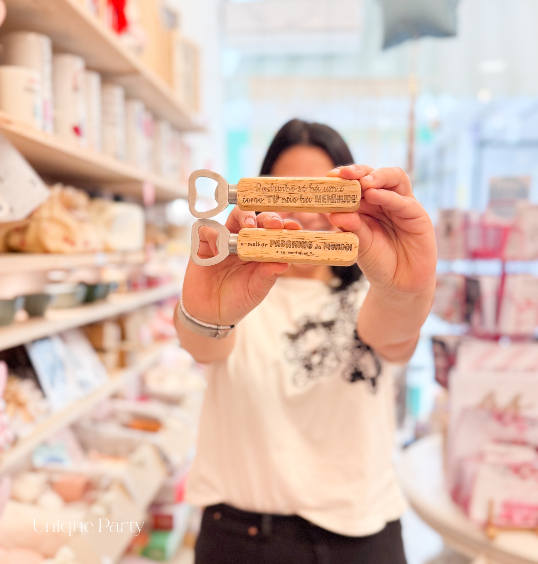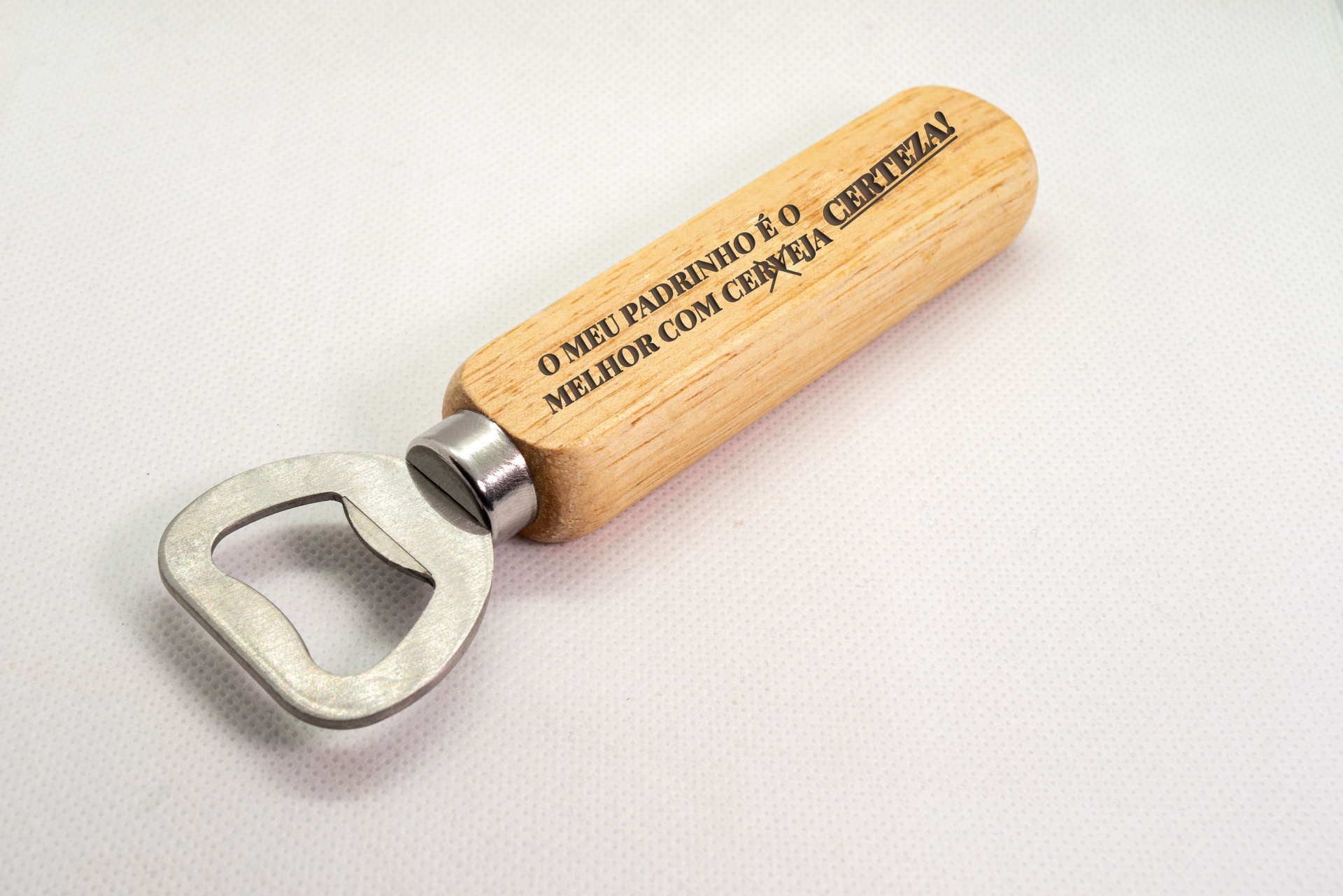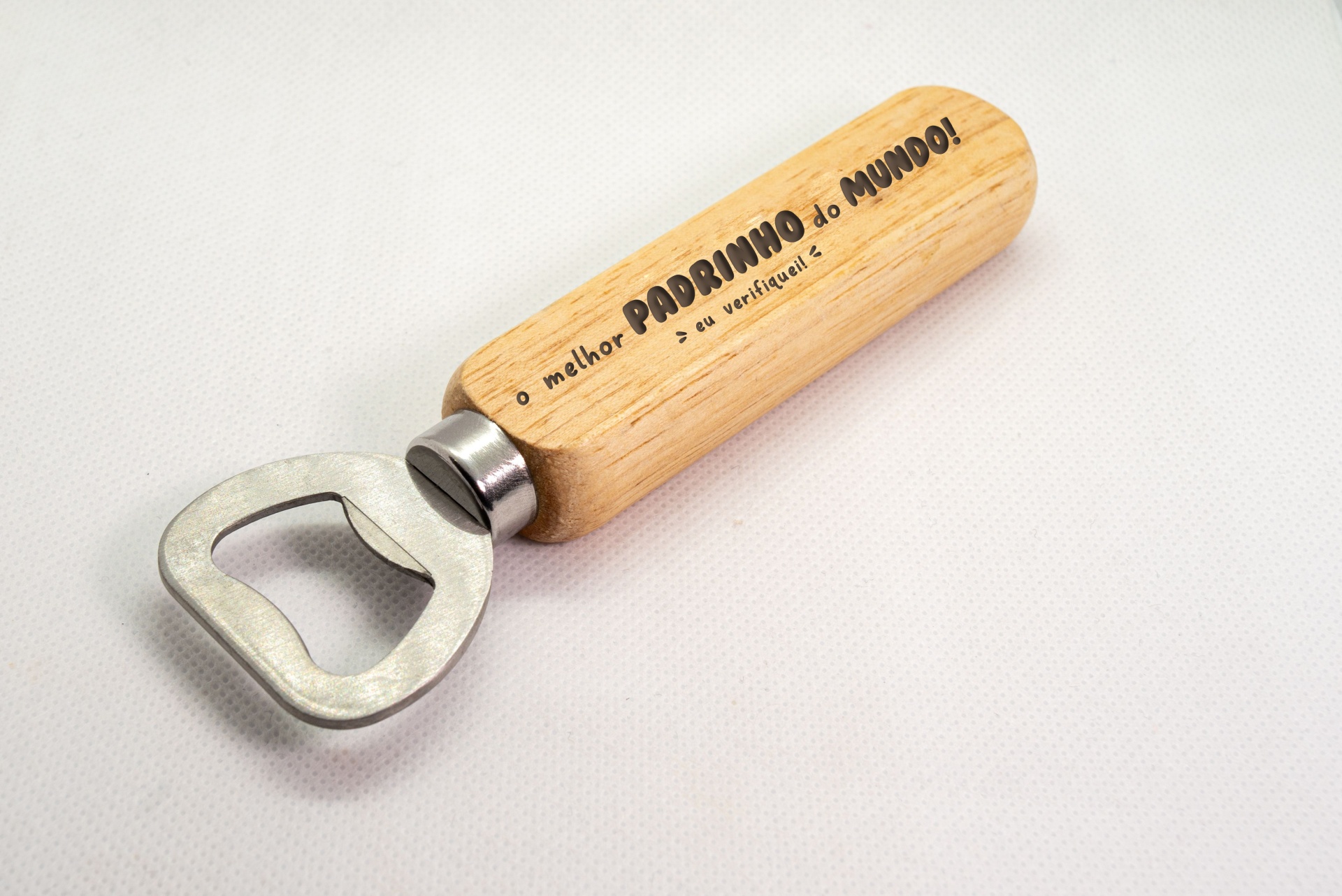 Surpreende o melhor padrinho com este abre caricas em madeira com mensagem gravada, a combinação perfeita entre utilidade e sentimento 🍻✨