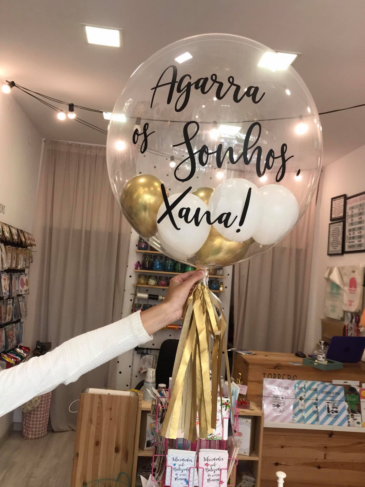 Home ARRANJOS + BALÕES PERSONALIZADOS Balão Inspirador Personalizado Balão Inspirador Personalizado OPÇÃO COR BALÕES INTERIORES ROSA+BRANCO+DOURADO AZUL+BRANCO+PRATA BRANCO+DOURADO BRANCO+PRATA OUTRA OPÇÃO -> FALA CONNOSCO ENCHIMENTO ENVIO CTT - VAZIO LEVANTAMENTO EM LOJA - CHEIO COM HÉLIO INFORMAÇÃO A PERSONALIZAR 18,99 € Desconto de %. IVA incluído. Comprar Contactar Adicionar à wishlist Celebra com um toque de inspiração! Balão bubble personalizado com a frase “Agarra os Sonhos”, mini balões no interior e tassel decorativo. Ideal para momentos especiais, festas ou ofertas com significado. Inclui: Balão Bubble 20" (51cm) redondo Vinil Tassel x 1 Mini Balões x 6(interior) NOTA:Confirme as opções de enchimento, antes de adicionar o produto no carrinho. Caso queira o balão cheio com hélio, para levantar nas nossas instalações, entraremos em contacto consigo para agendar o dia e hora. Partilhar