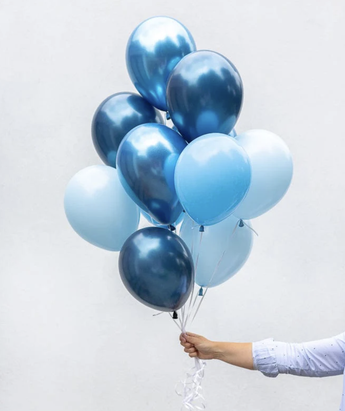 Contém 12 balões de látex em tons de azul denim lisos e cromados (27/30cm).