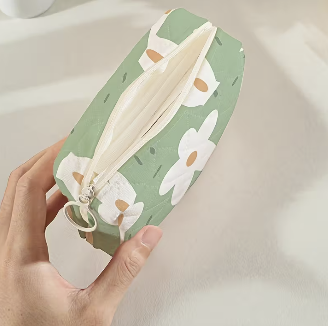 Feita em poliéster durável e acolchoado, oferece proteção e um toque suave ao mesmo tempo. O fecho de zíper seguro, mantém os teus essenciais bem guardados — perfeita para transportar produtos de higiene feminina, maquilhagem, fones de ouvido ou pequenos acessórios.