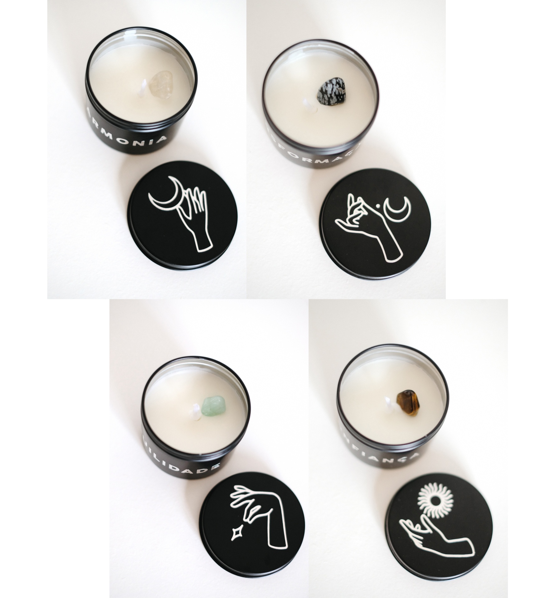 Vela de cera 100% vegetal com fragrância de baunilha. 120 ml de vela aromática em lata decorada com o propósito na frente, simbolo na tampa e pedra/cristal correspondente.