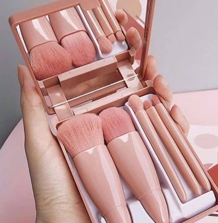 Conjunto de 5 Mini Pincéis de Maquilhagem Portáteis com Espelho