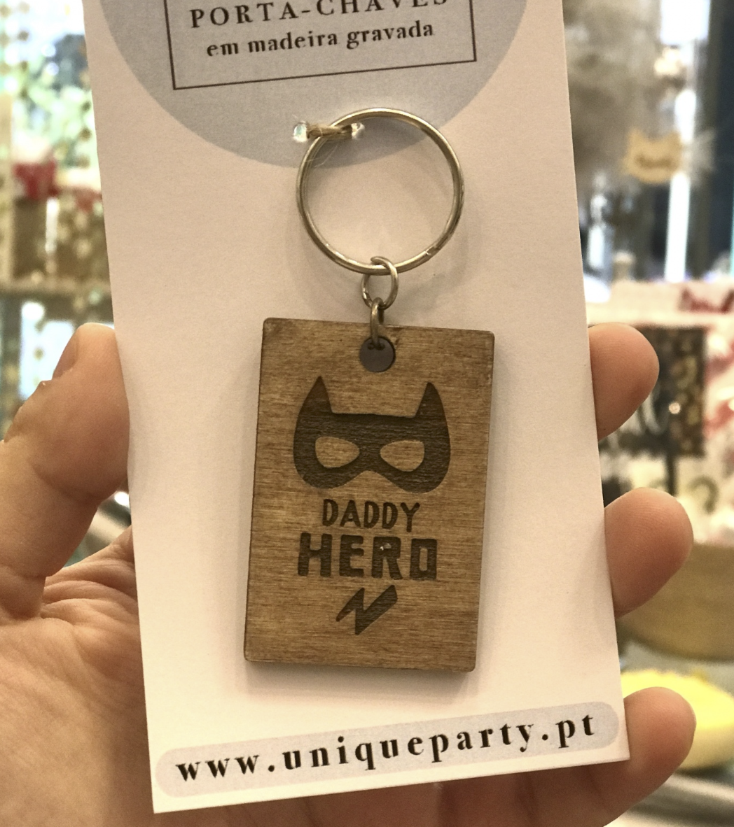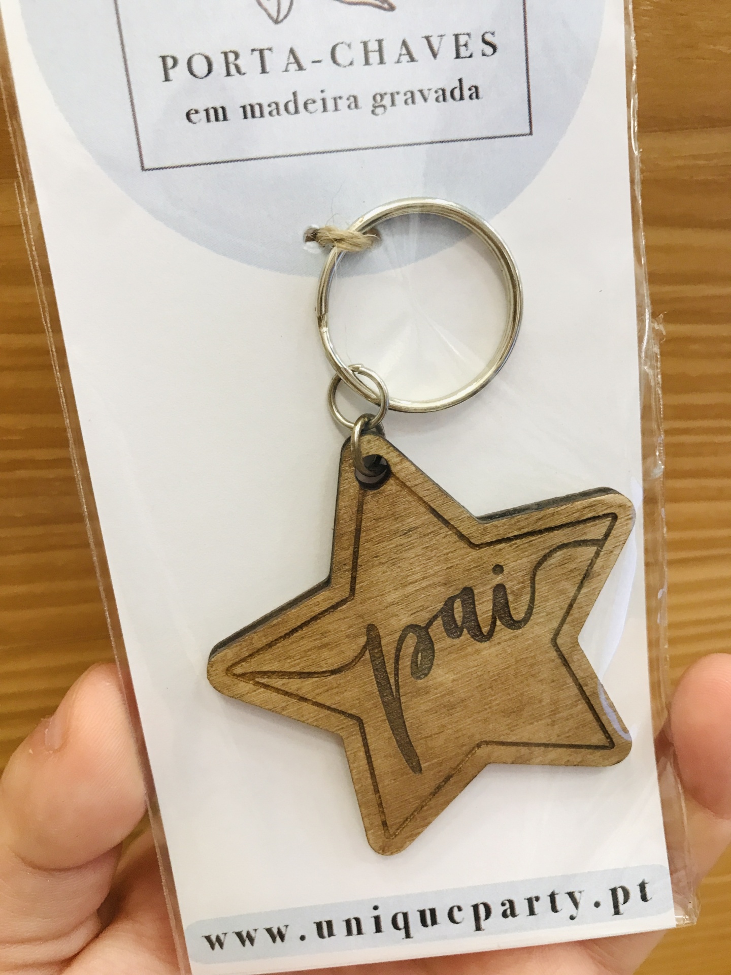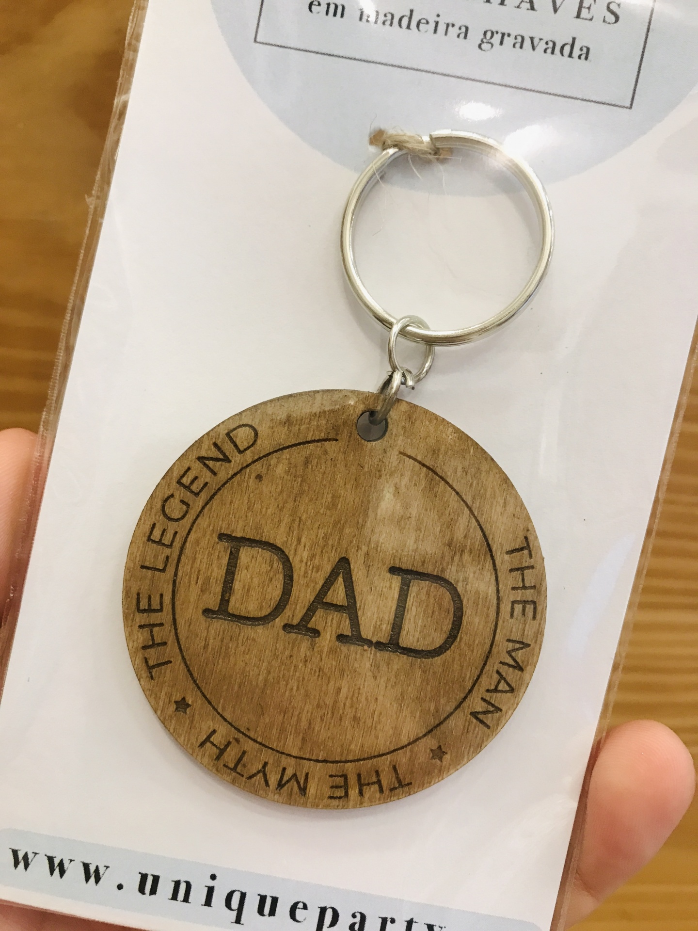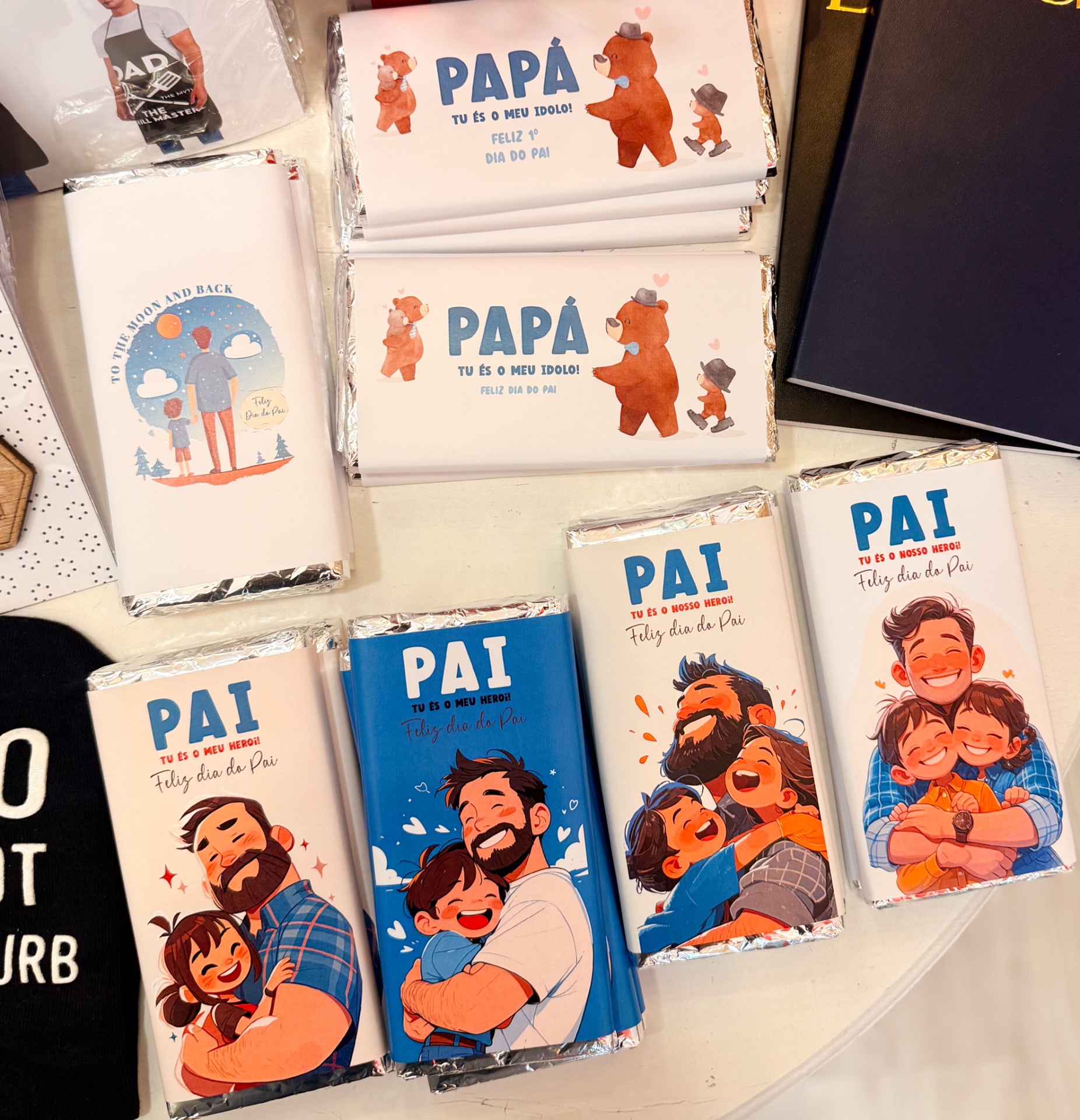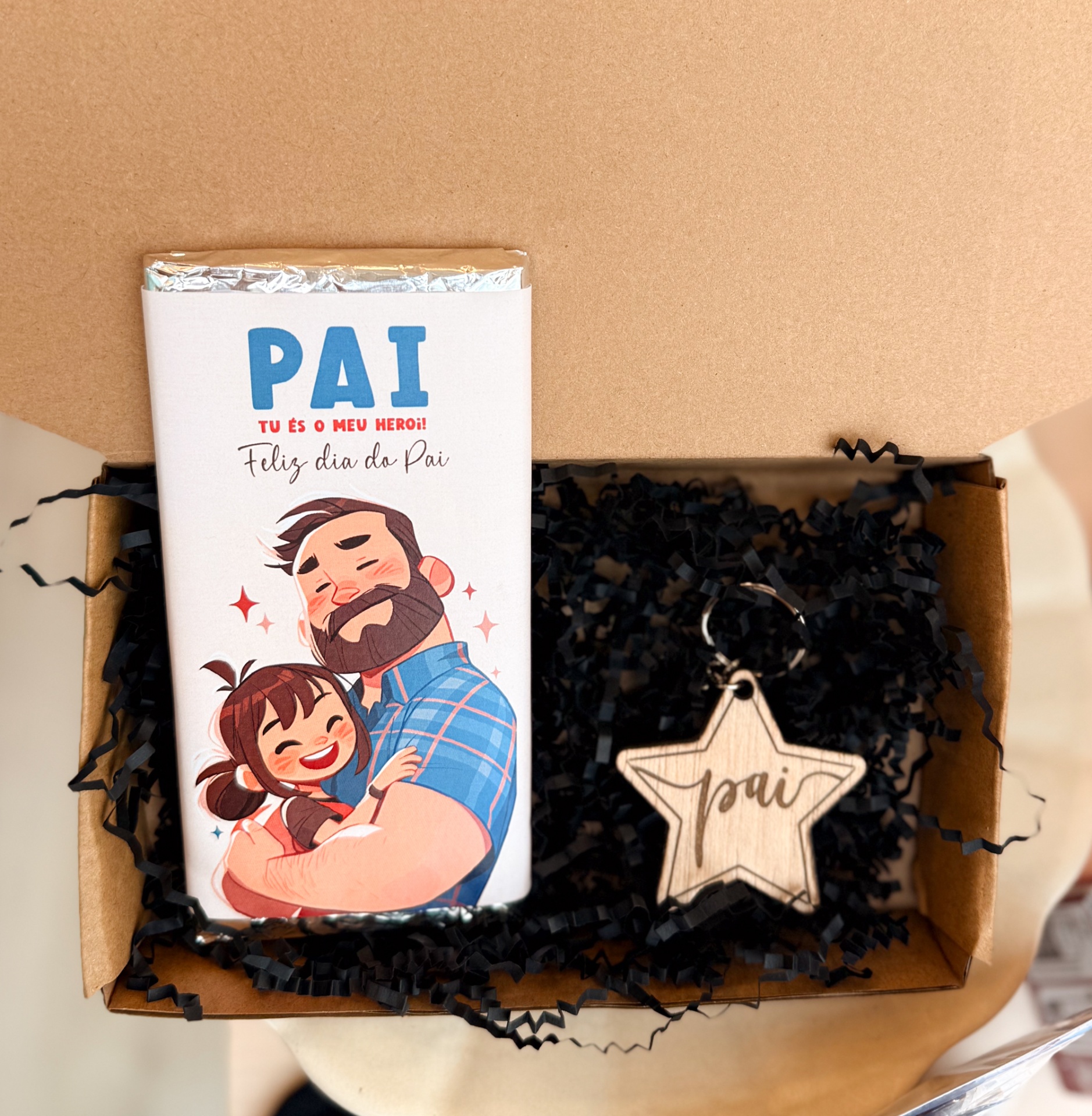 Surpreende no Dia do Pai com um kit especial: chocolate de leite delicioso e porta-chaves em madeira gravado. Um gesto simples, mas cheio de carinho.