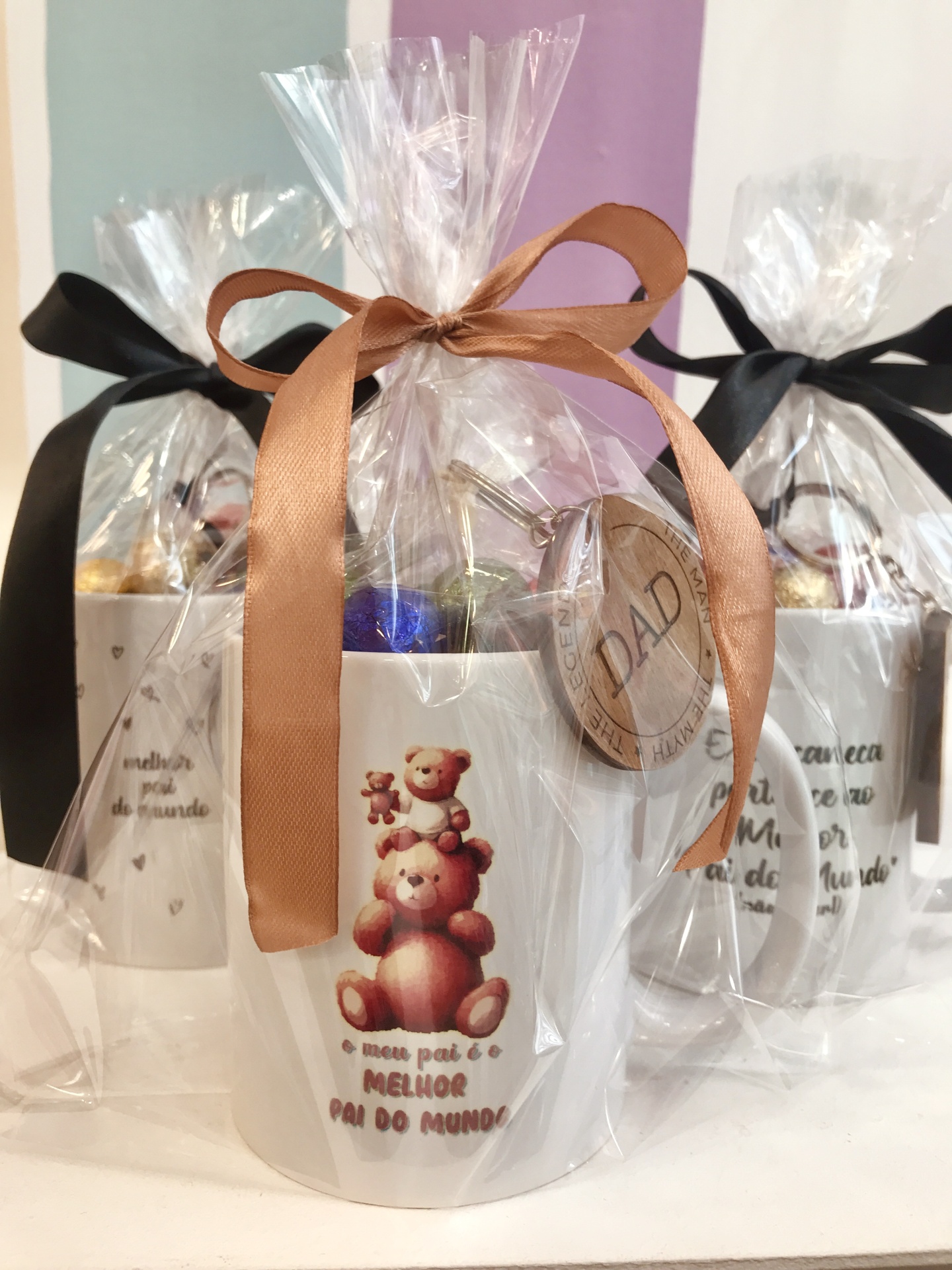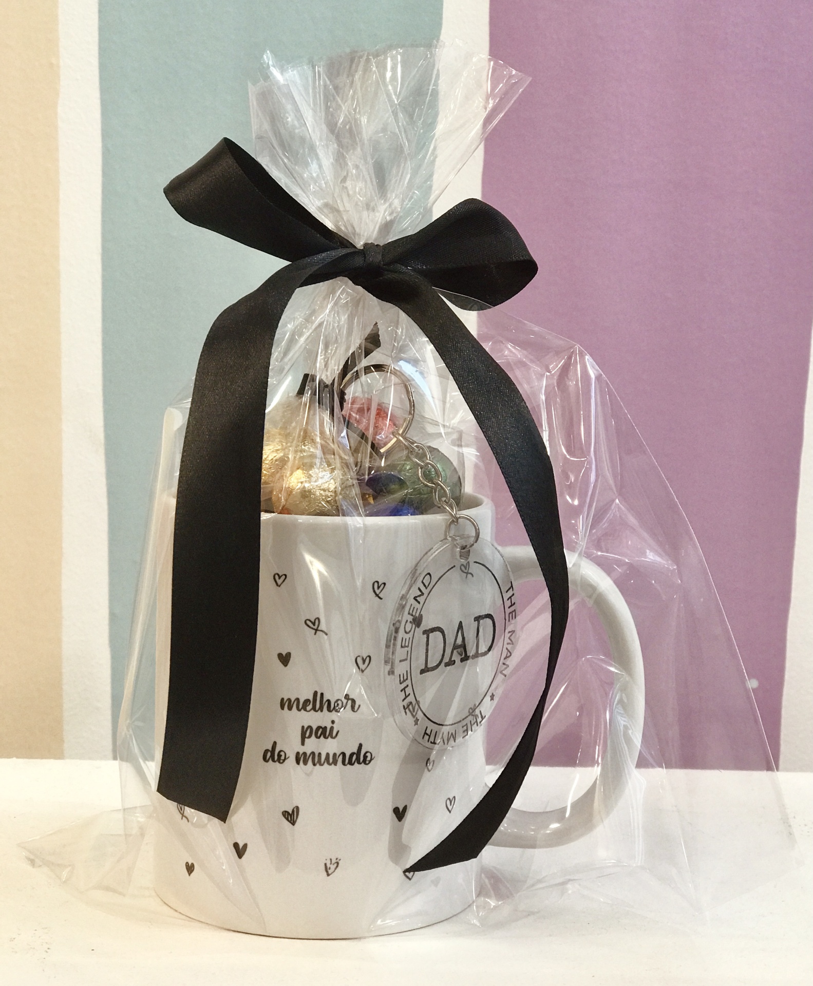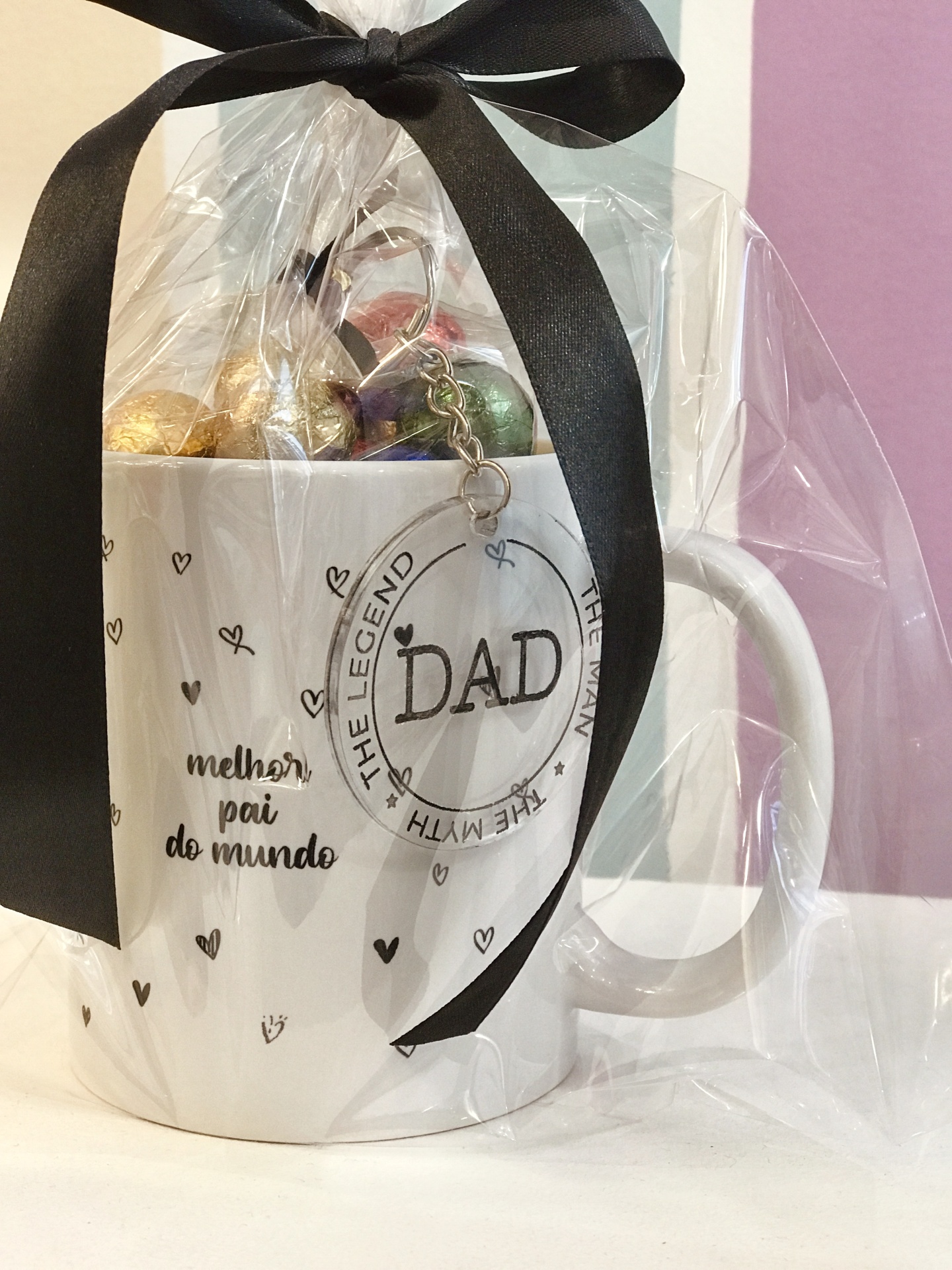 Celebra o melhor pai com este conjunto especial: caneca de cerâmica, deliciosos bombons de chocolate de leite e porta-chaves em acrílico. Um mimo cheio de carinho!
