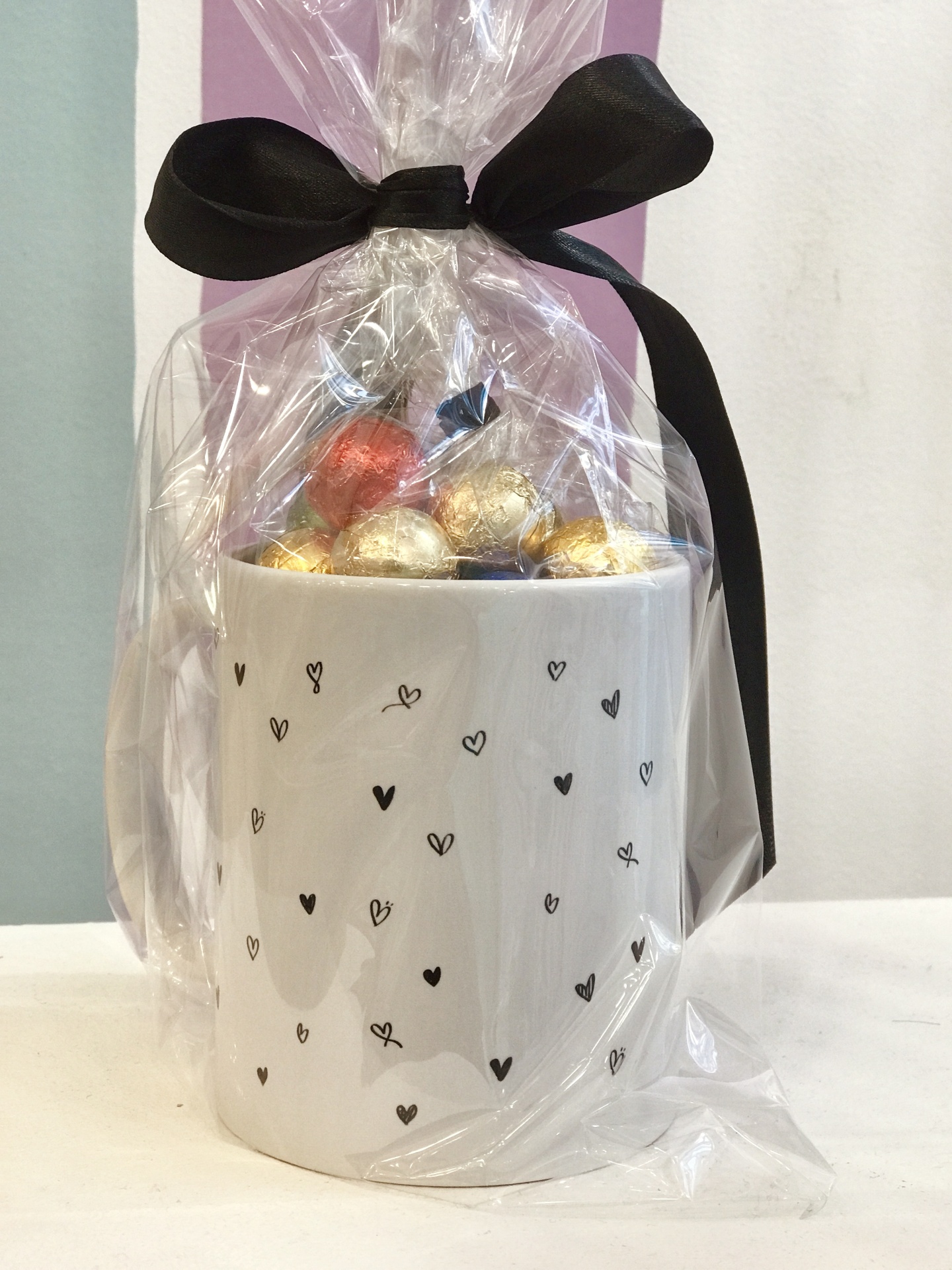 Conjunto com caneca de cerâmica + bombons chocolate de leite + porta-chaves em acrilico