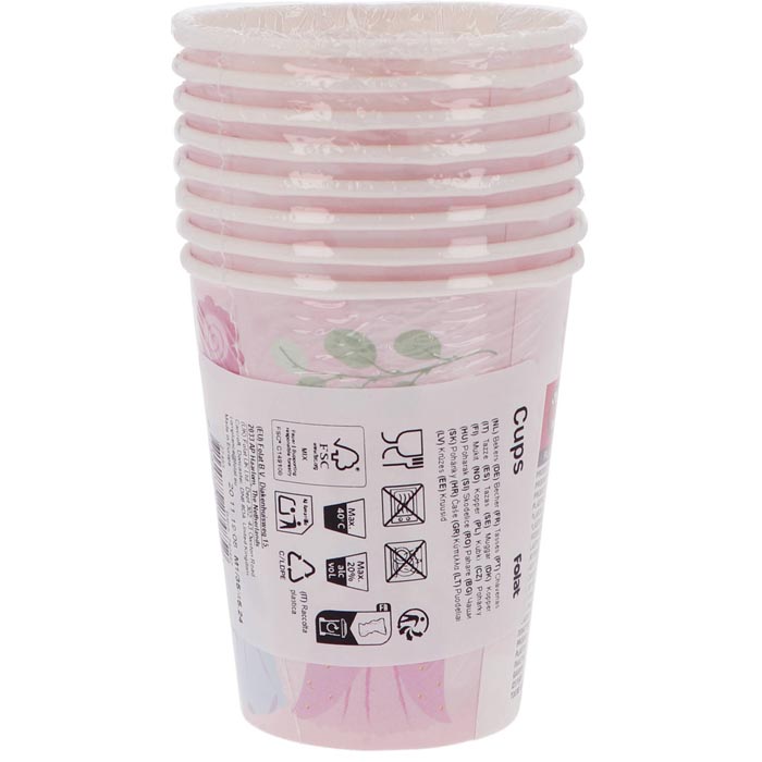 O conjunto contém 8 copos de papel rosa suave com capacidade de 250ml, ilustrados com 4 princesas encantadoras.