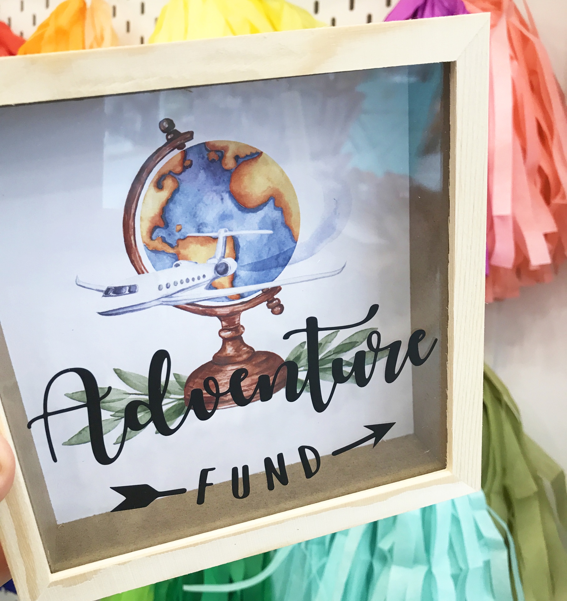 Mealheiro com ranhura em cima, imagem no fundo e mensagem no vidro.