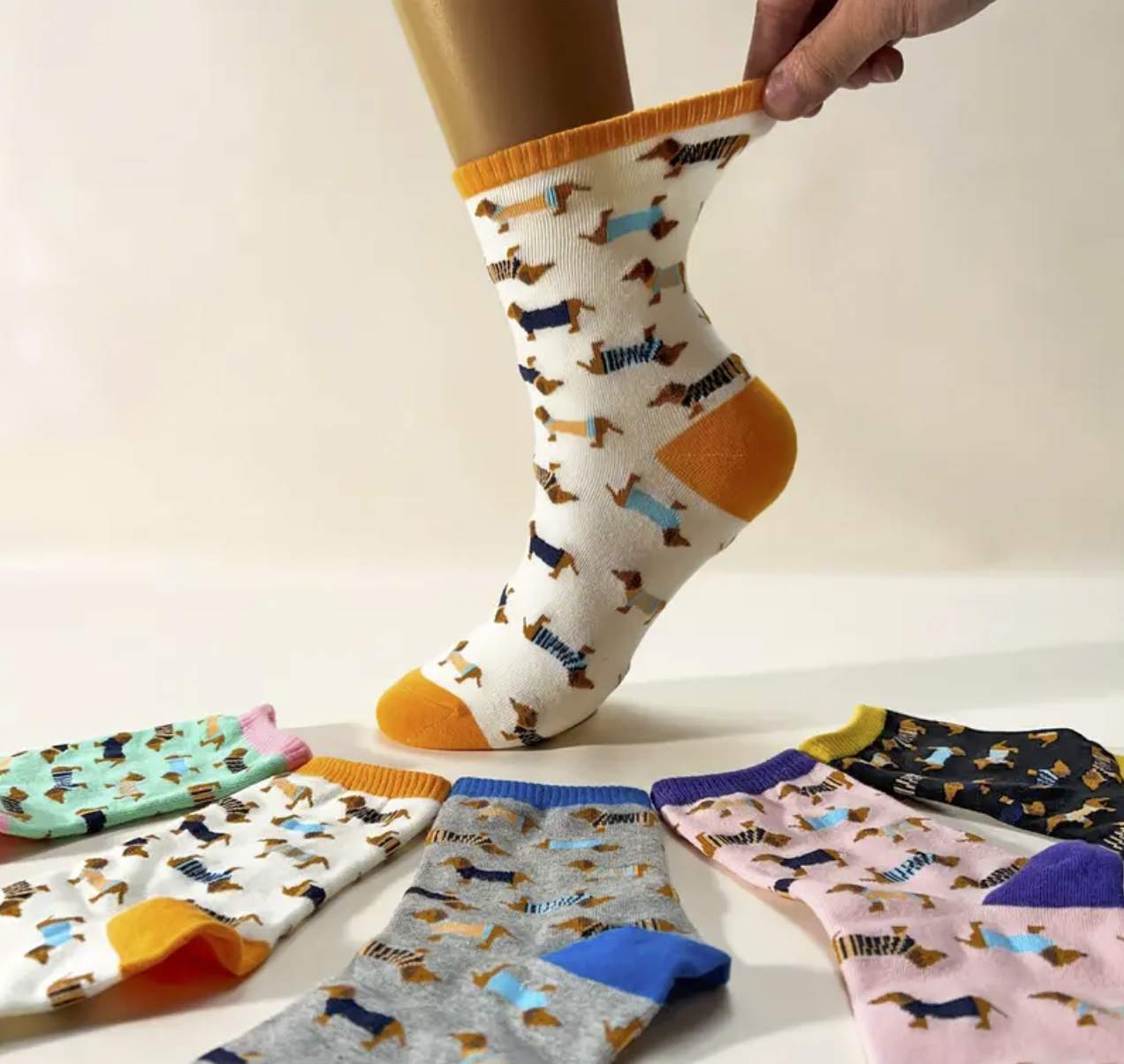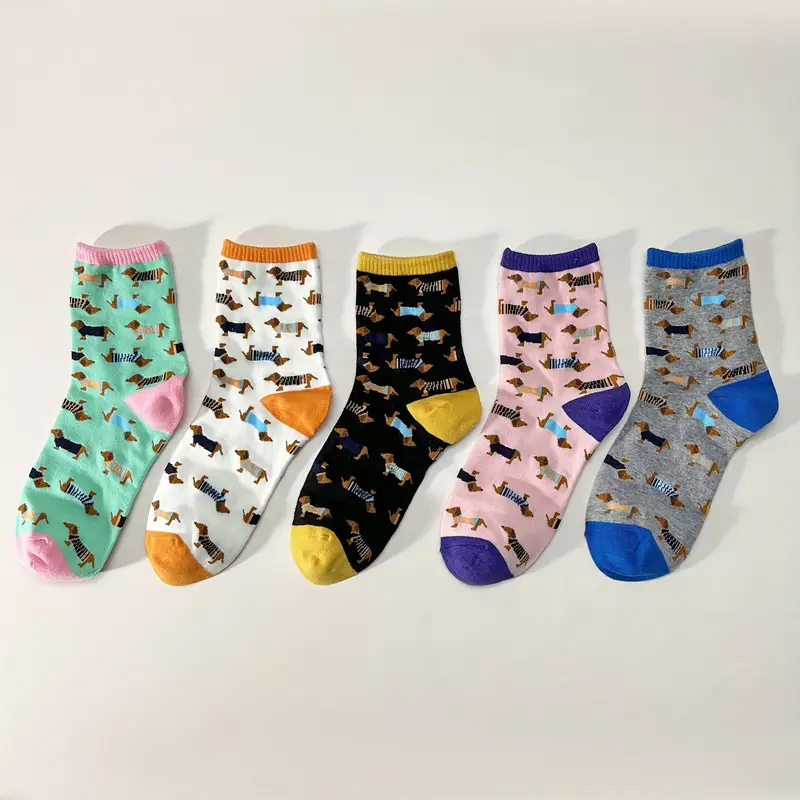 Estas meias femininas destacam-se pelo padrão de cães super fofos, que dão um toque divertido e original ao teu dia a dia.