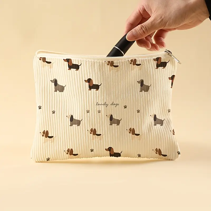 Organiza os teus essenciais de beleza com estilo e diversão com esta bolsa de viagem decorada com uma estampa irresistível de cães.