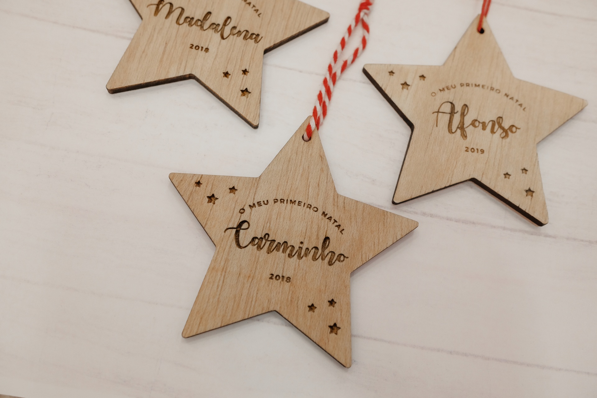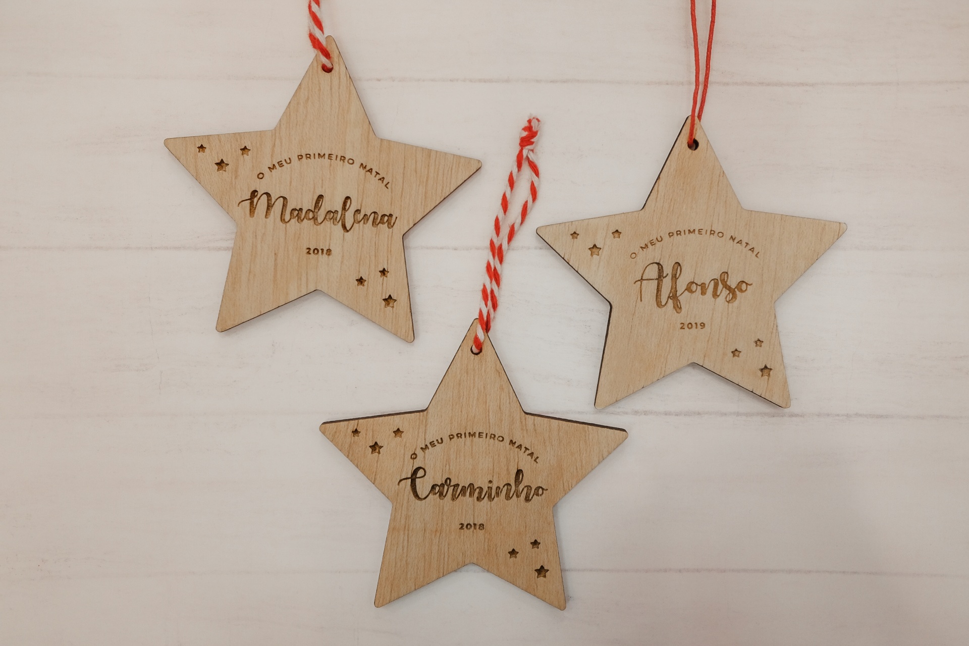 📦 Inclui: • Ornamento em forma de estrela em madeira contraplacada • Gravação “O Meu Primeiro Natal” • Personalização com nome e ano • Cordão para pendurar (se aplicável)