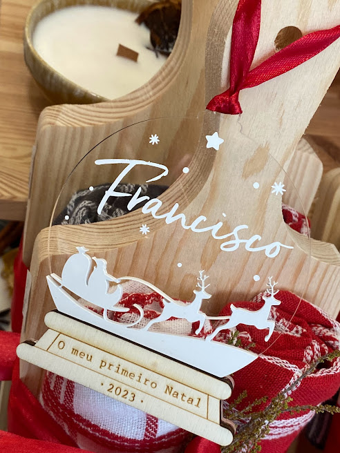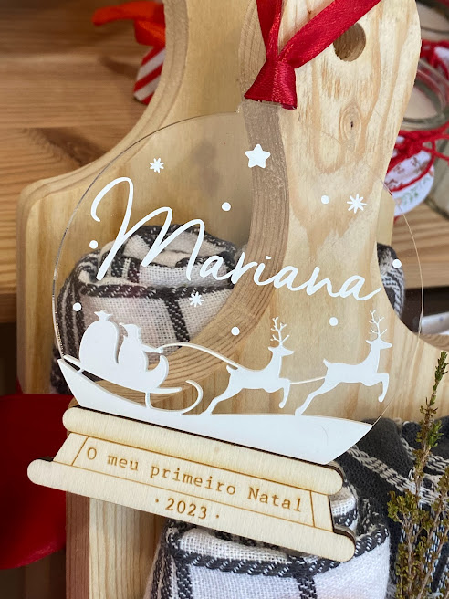 📦 Inclui: • Ornamento em forma de globo de neve em madeira contraplacada • Gravação “O Meu Primeiro Natal” + ano • Trenó e renas recortados em acrílico branco • Globo frontal em acrílico transparente com nome em vinil • Cordão para pendurar (se aplicável)
