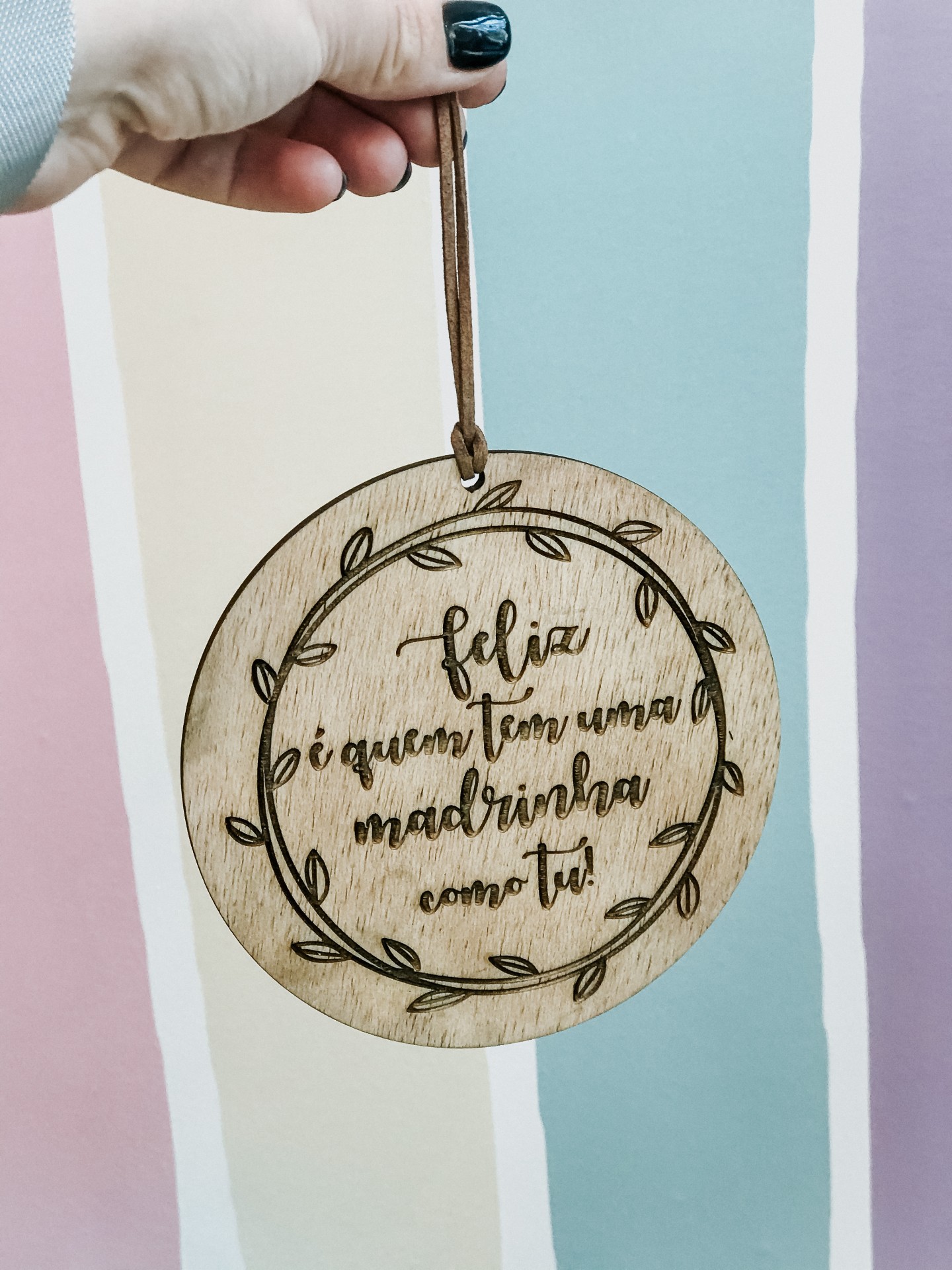 📦 Inclui: • Placa/ornamento redondo em madeira contraplacada • Gravação com “Feliz é quem tem uma madrinha/padrinho como tu” • Cordão para pendurar (se aplicável)