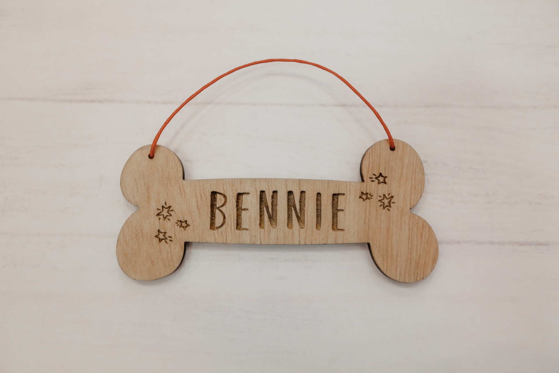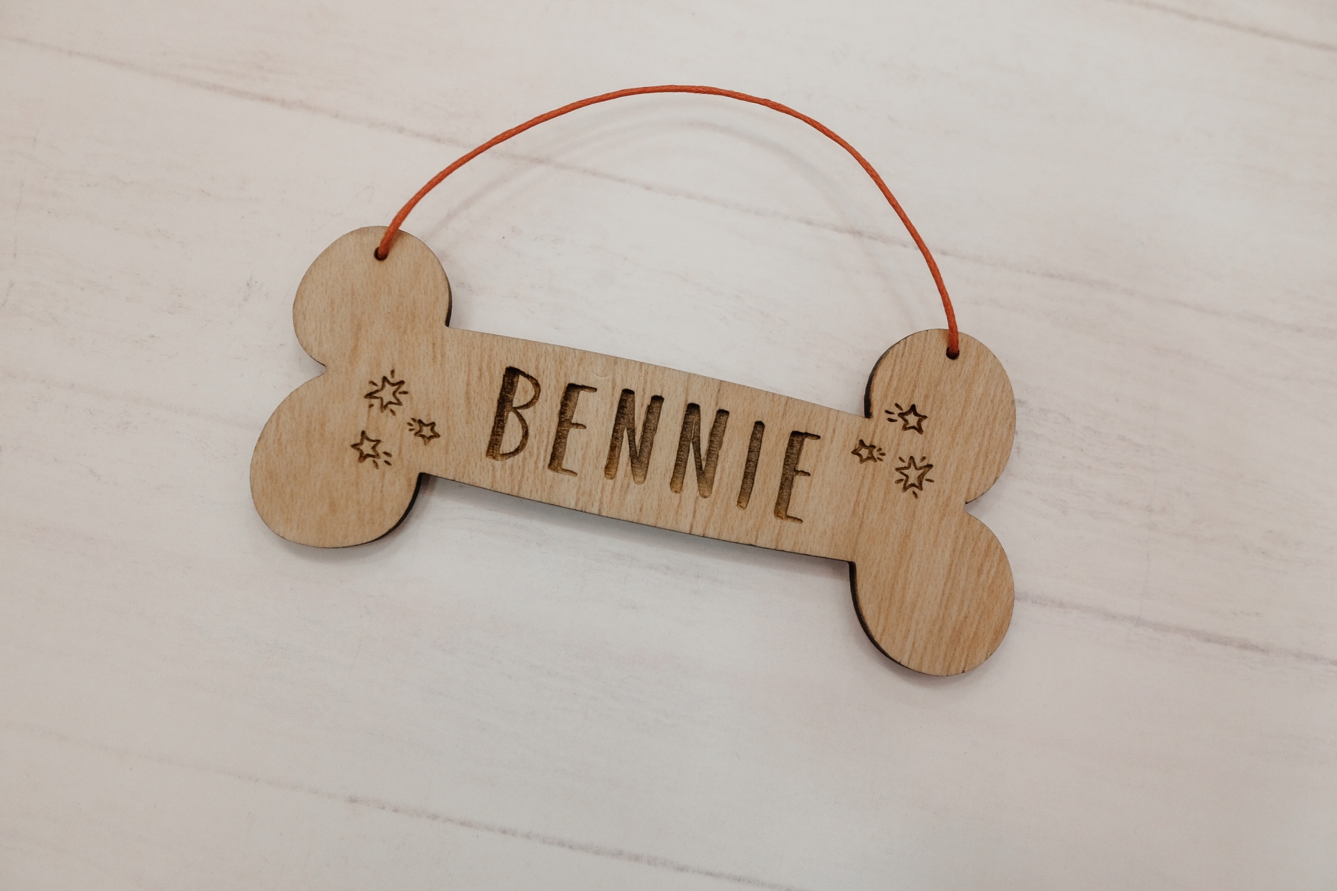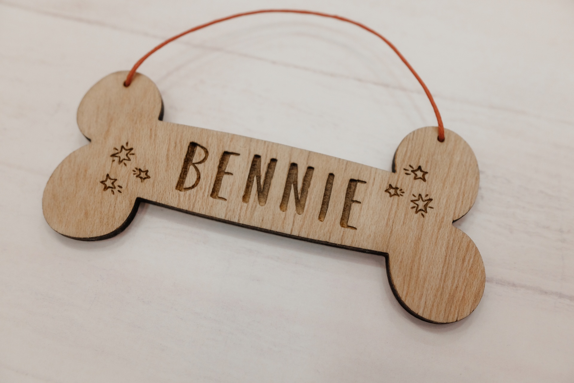 Dá um toque especial e cheio de amor à tua decoração com este ornamento em madeira contraplacada, recortado e gravado em forma de osso, totalmente personalizado com o nome do(s) teu(s) cão(ães) 🐶✨