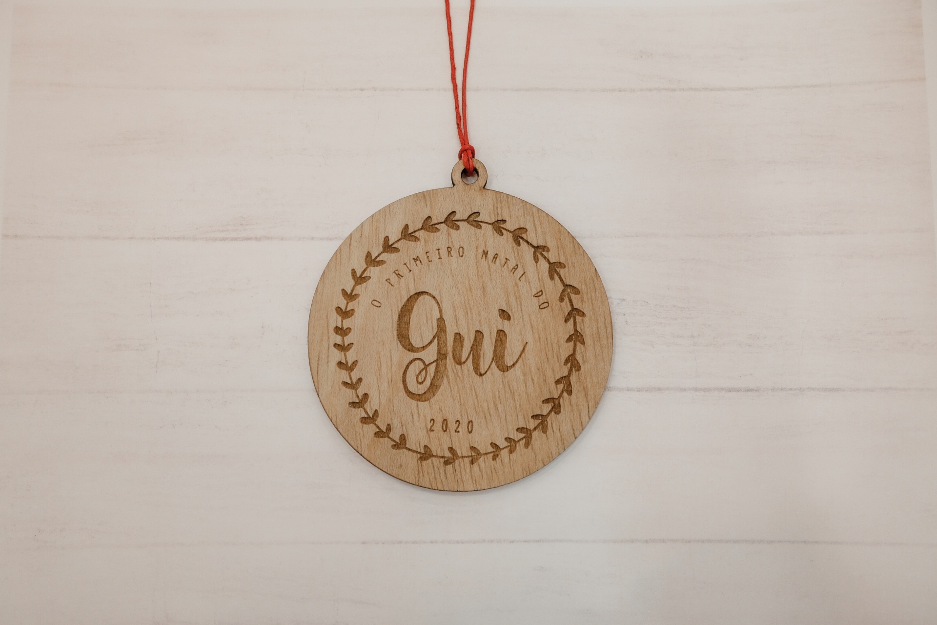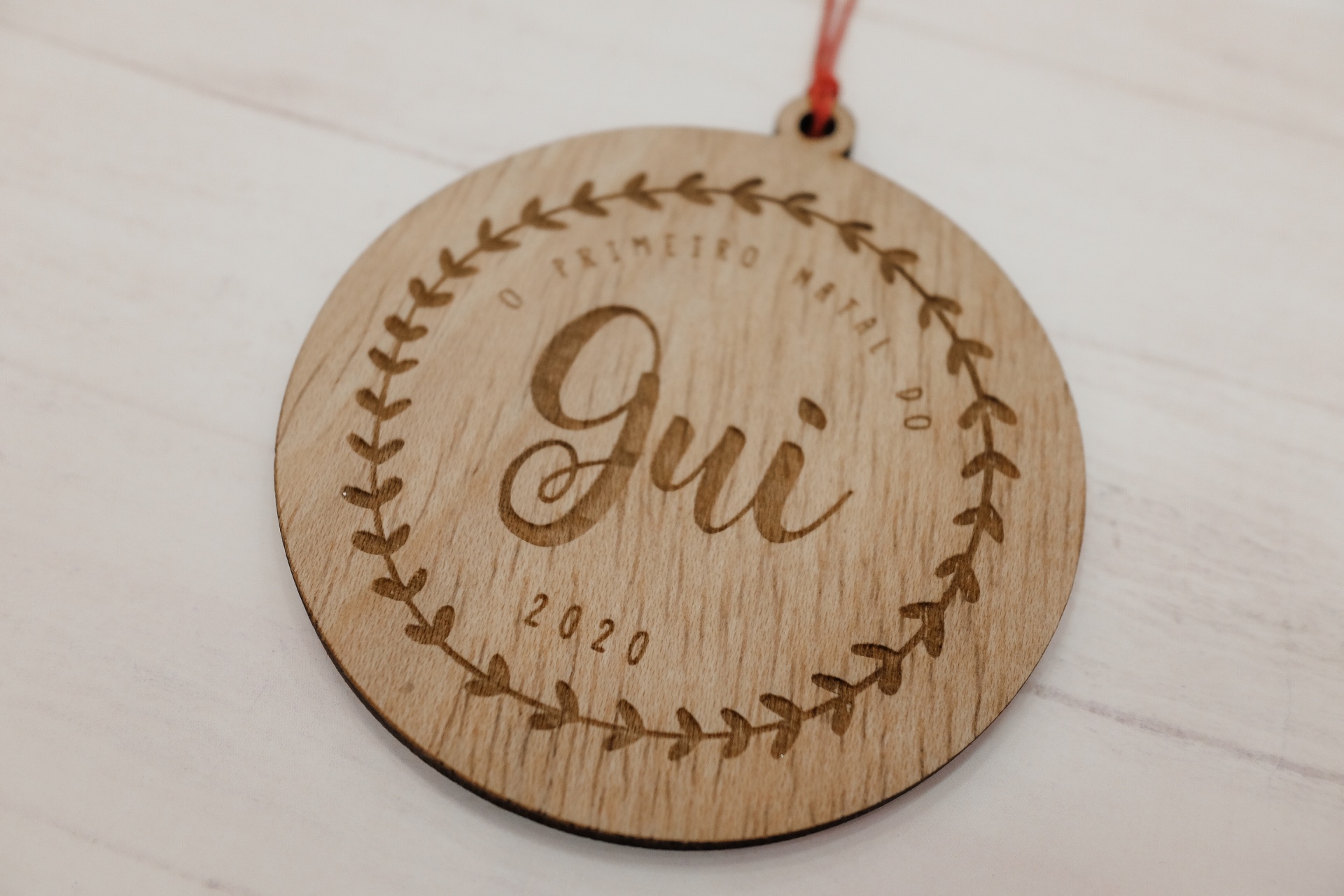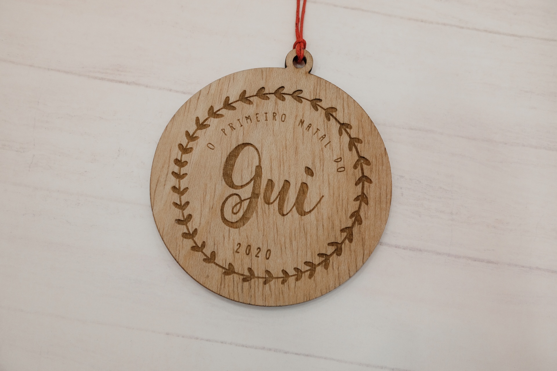 📦 Inclui: • Ornamento redondo em madeira contraplacada • Gravação “Primeiro Natal do…” • Nome e ano personalizados • Cordão para pendurar (se aplicável)