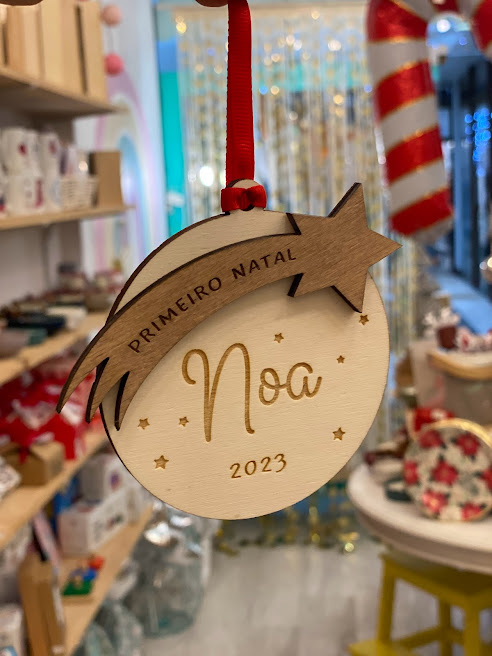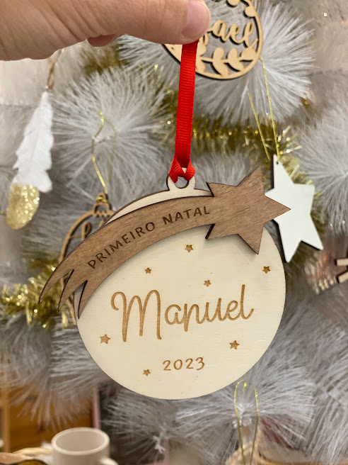 📦 Inclui: • Ornamento redondo em madeira contraplacada com nome e ano gravados • Estrela cadente em MDF com a frase “Primeiro Natal” • Cordão para pendurar (se aplicável)