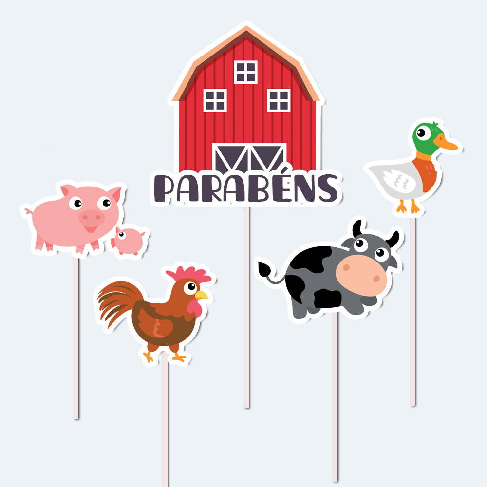 – Topos Altos: 5 unidades com vaquinhas, porquinhos, o celeiro e mais, ideais para dar vida ao bolo principal.