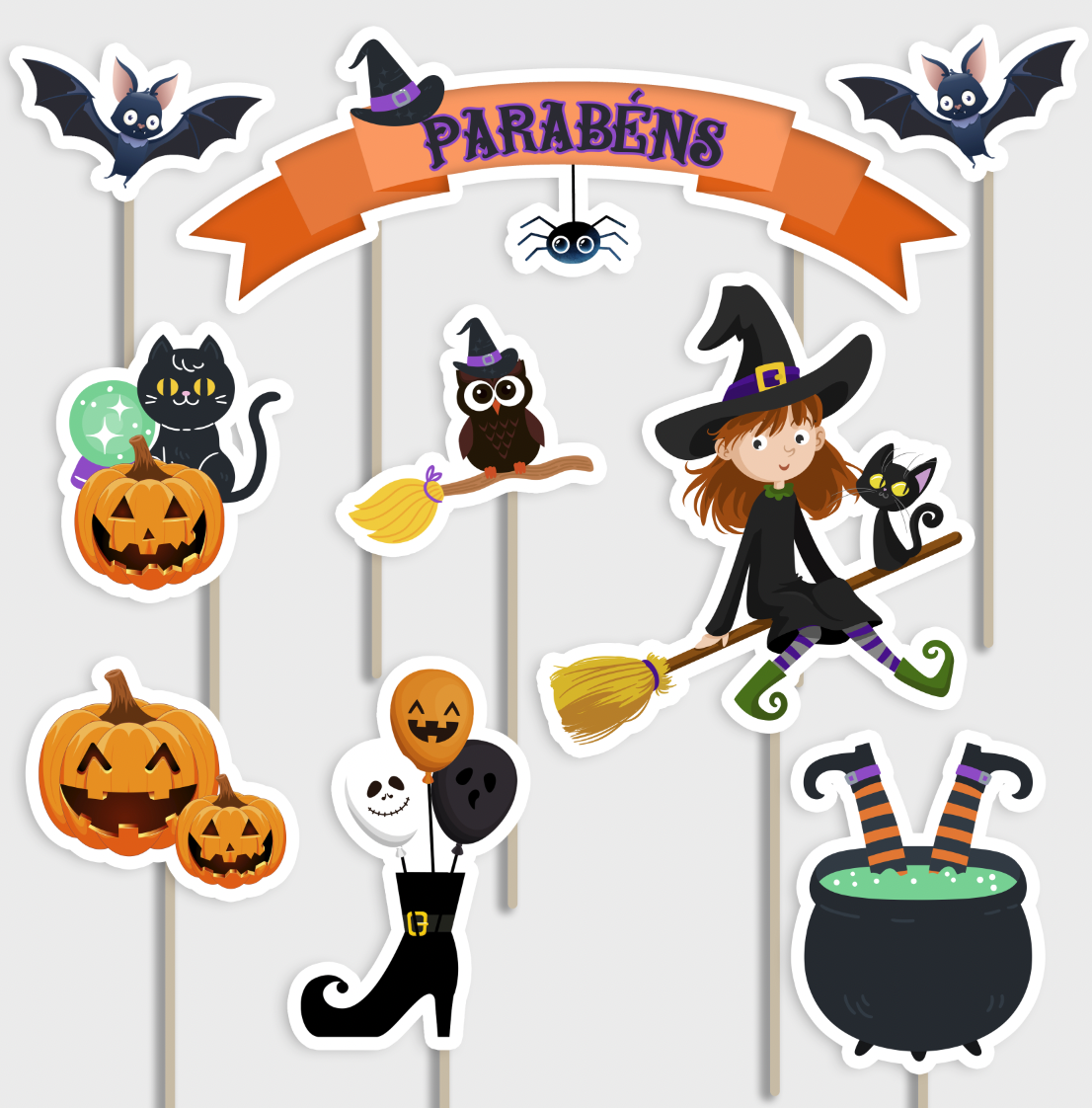 Dá um toque de magia e mistério à tua festa com este encantador conjunto de topos de bolo do tema Bruxinha!