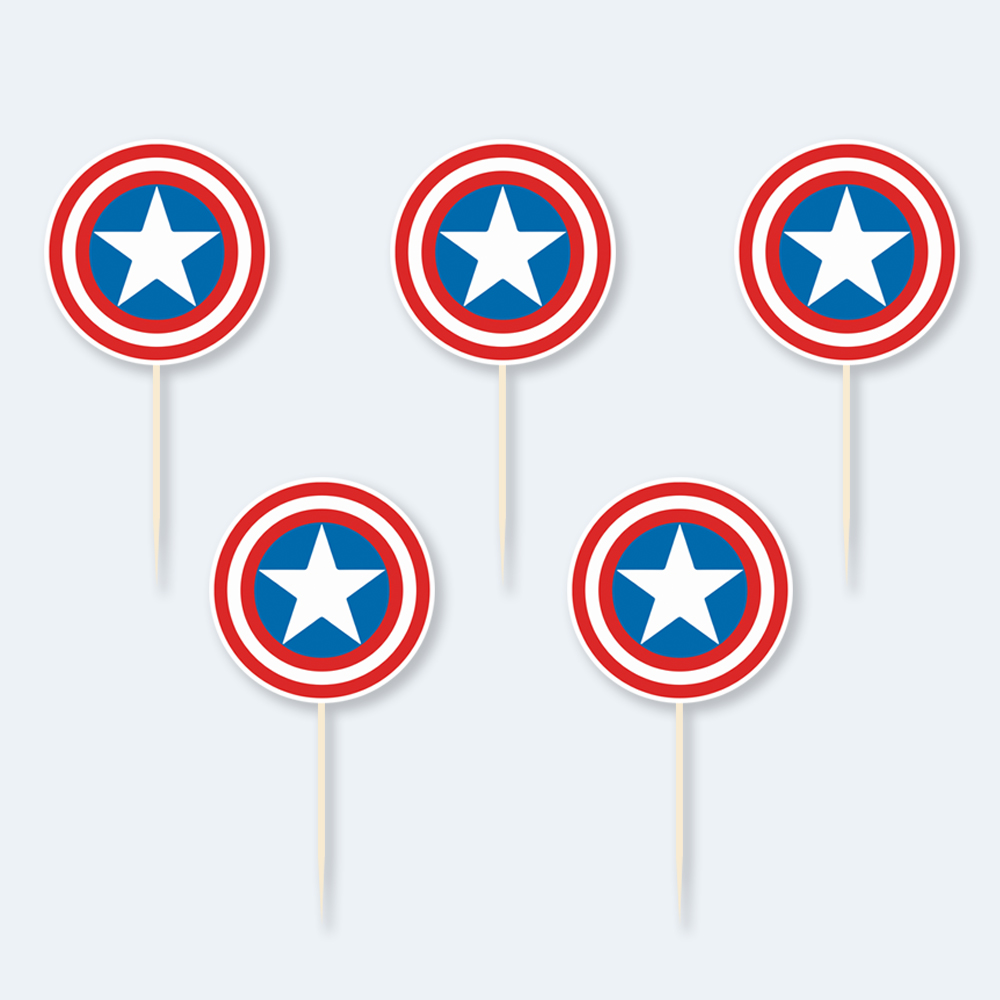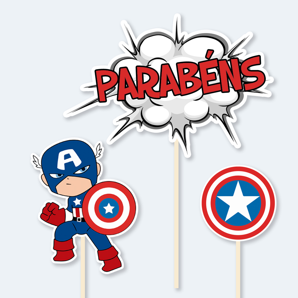 – Topos Altos: 3 unidades para dar destaque ao bolo principal com o escudo e a força do Capitão.