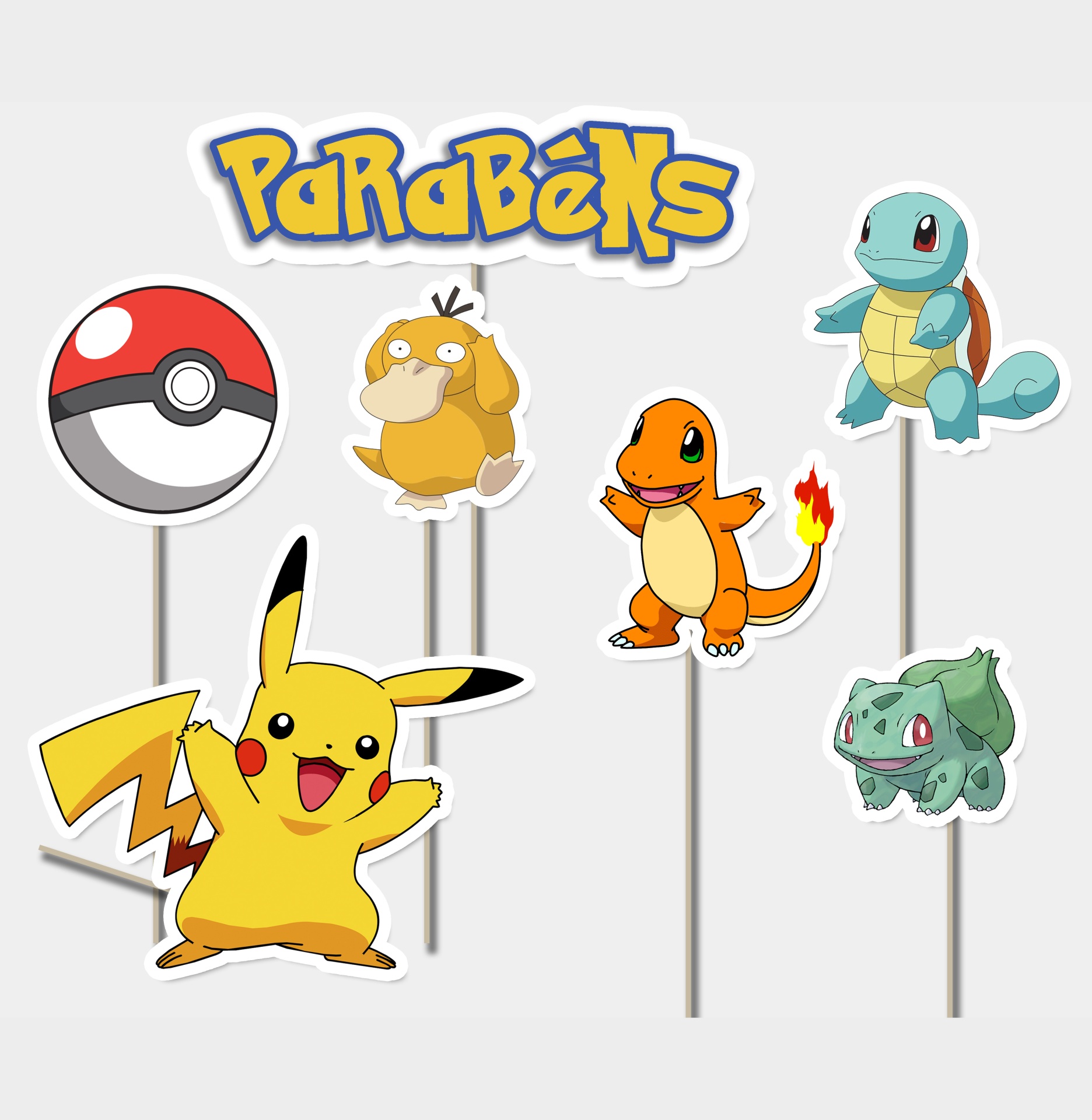 Decore o bolo da sua festa com este conjunto de 7 topos de bolo do tema Pokémon, feitos em papel 200g de alta qualidade com margem branca e suporte em madeira para maior estabilidade.