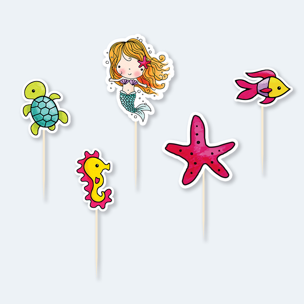 – Topos Altos: 3 unidades com a mensagem “Let’s Be Mermaids”, perfeitos para dar brilho e encanto ao bolo principal.