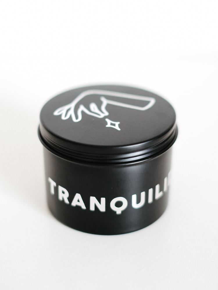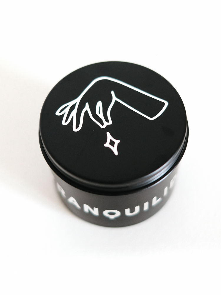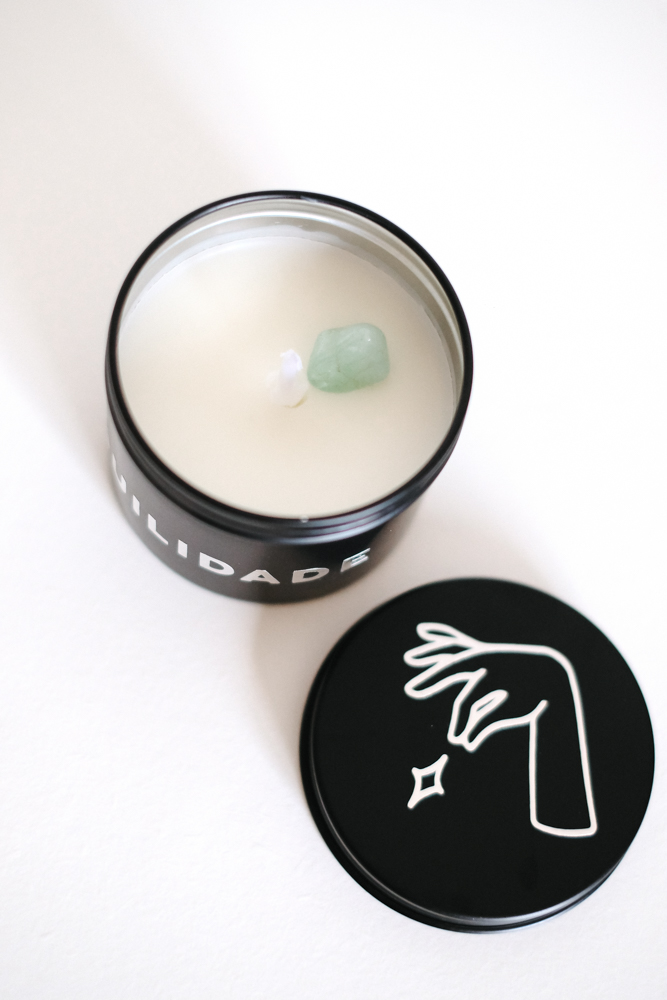 120 ml de vela aromática em lata decorada com o propósito na frente, simbolo na tampa e pedra/cristal correspondente.
