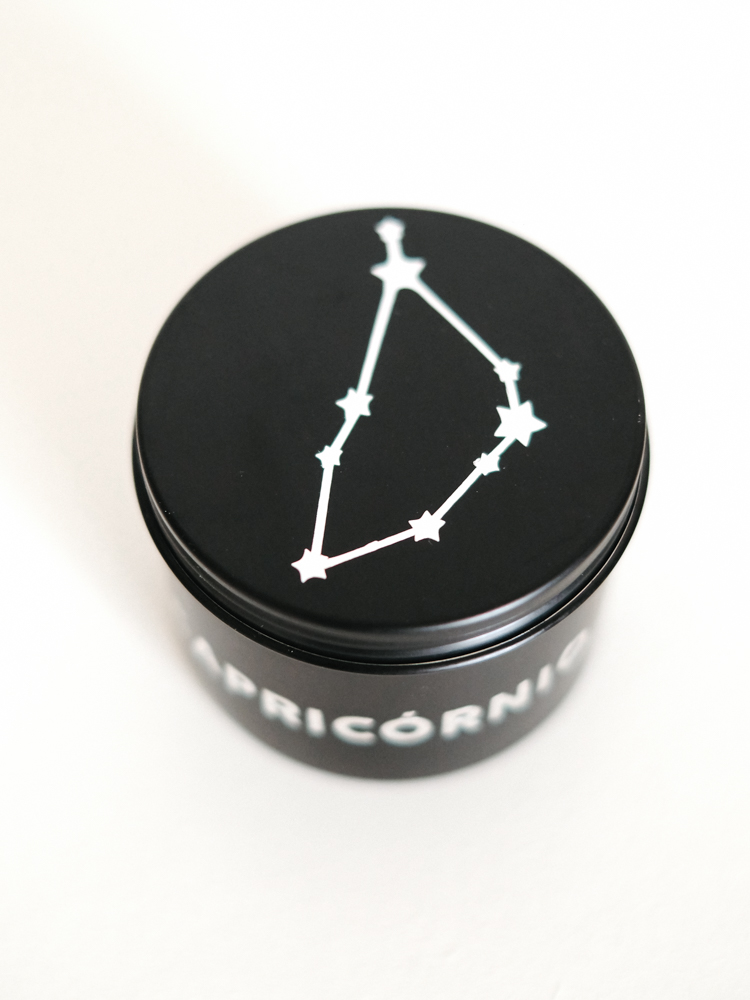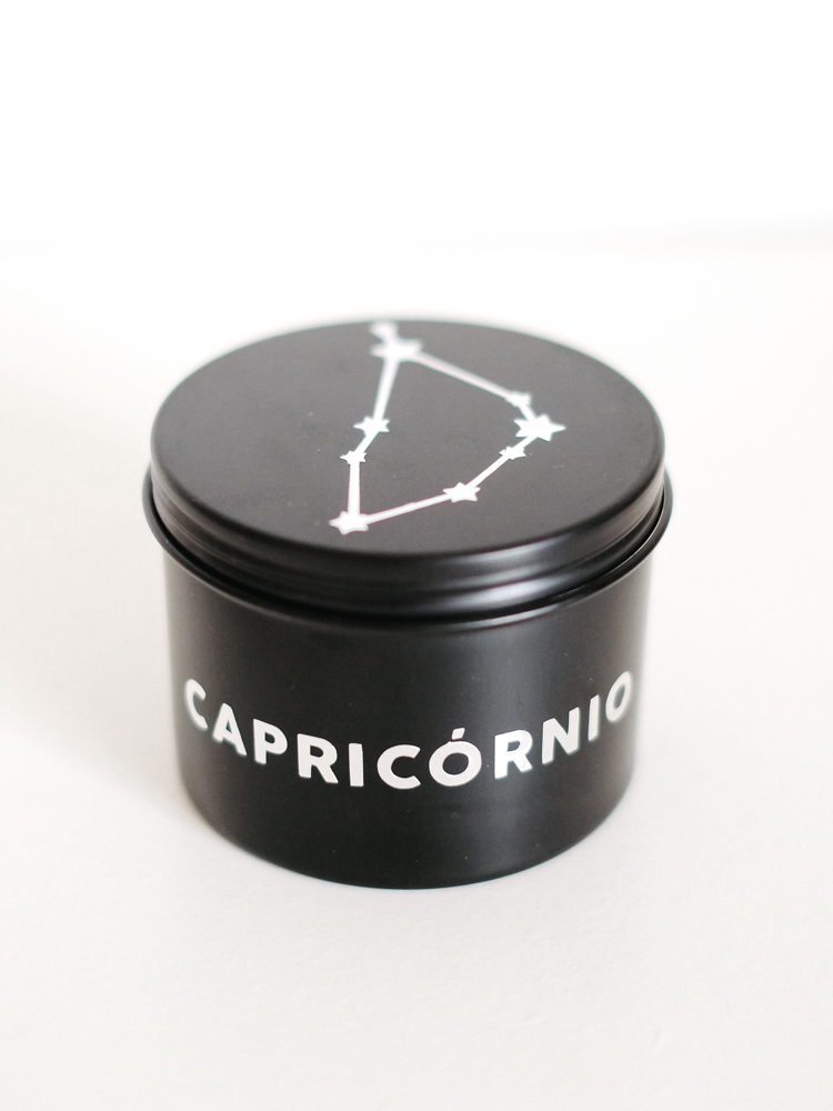 120 ml de vela aromática em lata decorada com nome de cada signo e constelação na tampa e pedra/cristal de cada signo.