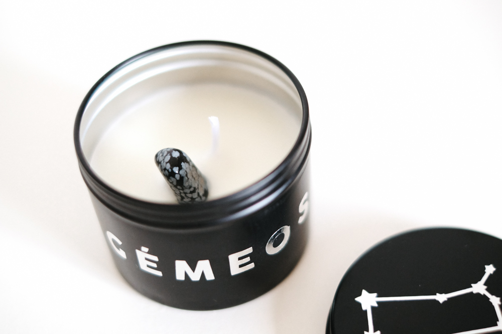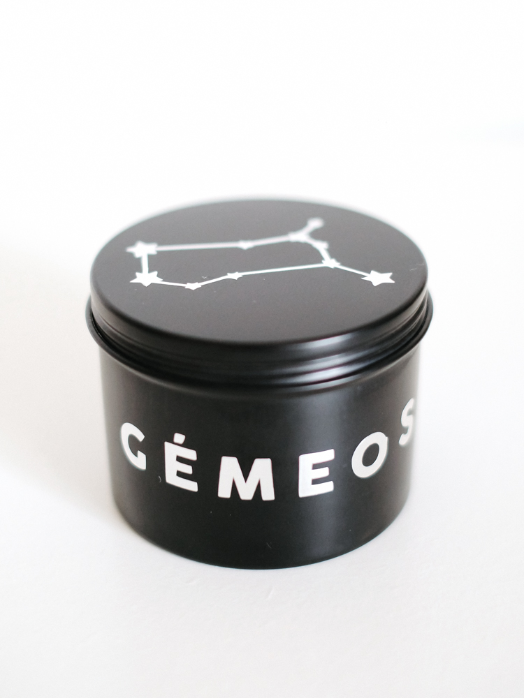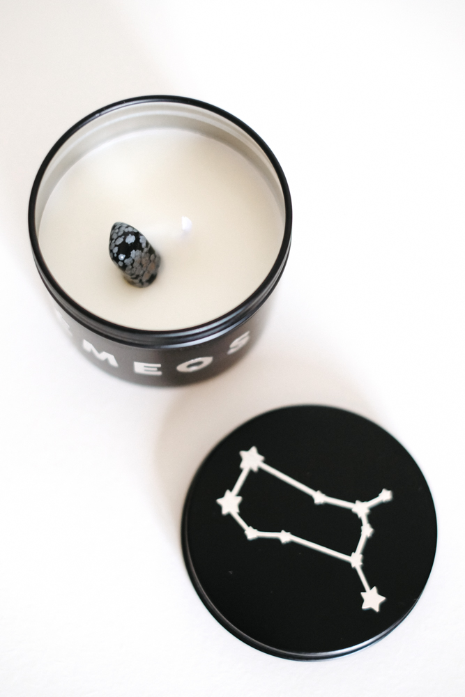 120 ml de vela aromática em lata decorada com nome de cada signo e constelação na tampa e pedra/cristal de cada signo.
