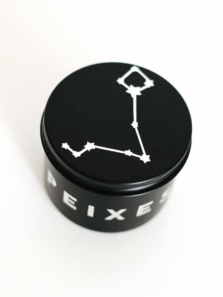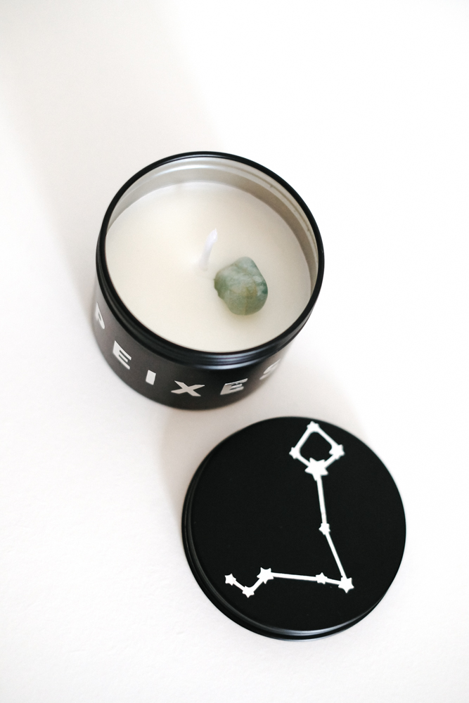 120 ml de vela aromática em lata decorada com nome de cada signo e constelação na tampa e pedra/cristal de cada signo.