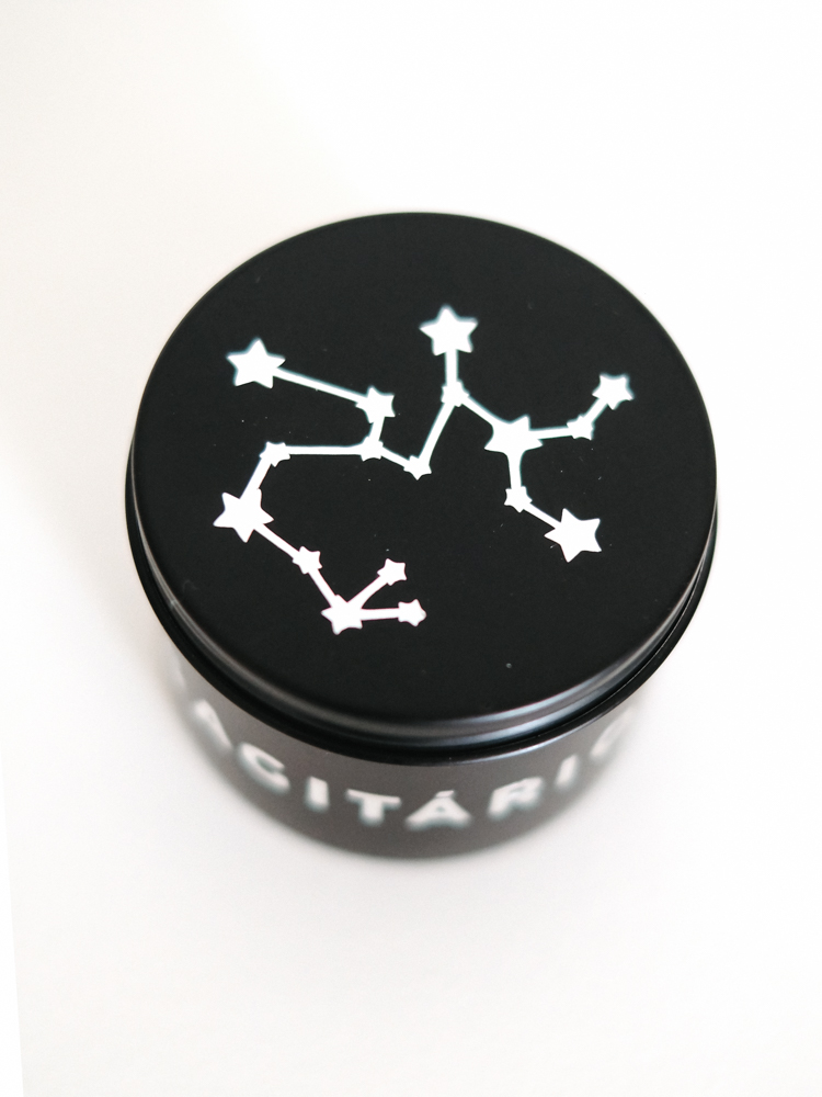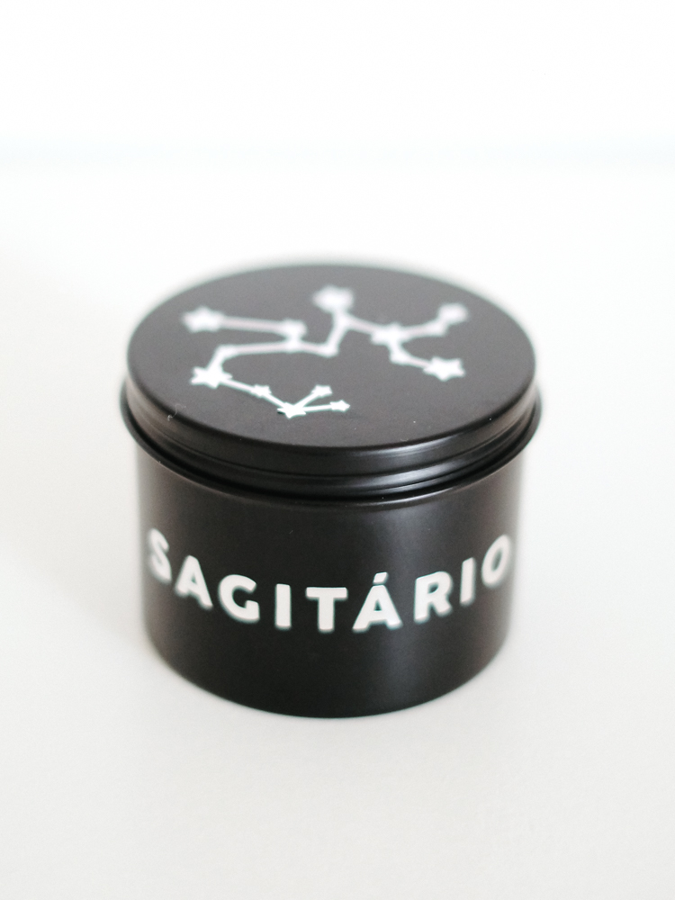 120 ml de vela aromática em lata decorada com nome de cada signo e constelação na tampa e pedra/cristal de cada signo.