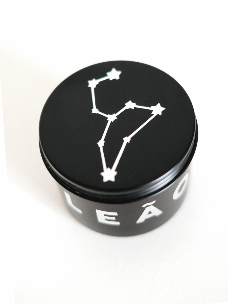 120 ml de vela aromática em lata decorada com nome de cada signo e constelação na tampa e pedra/cristal de cada signo.