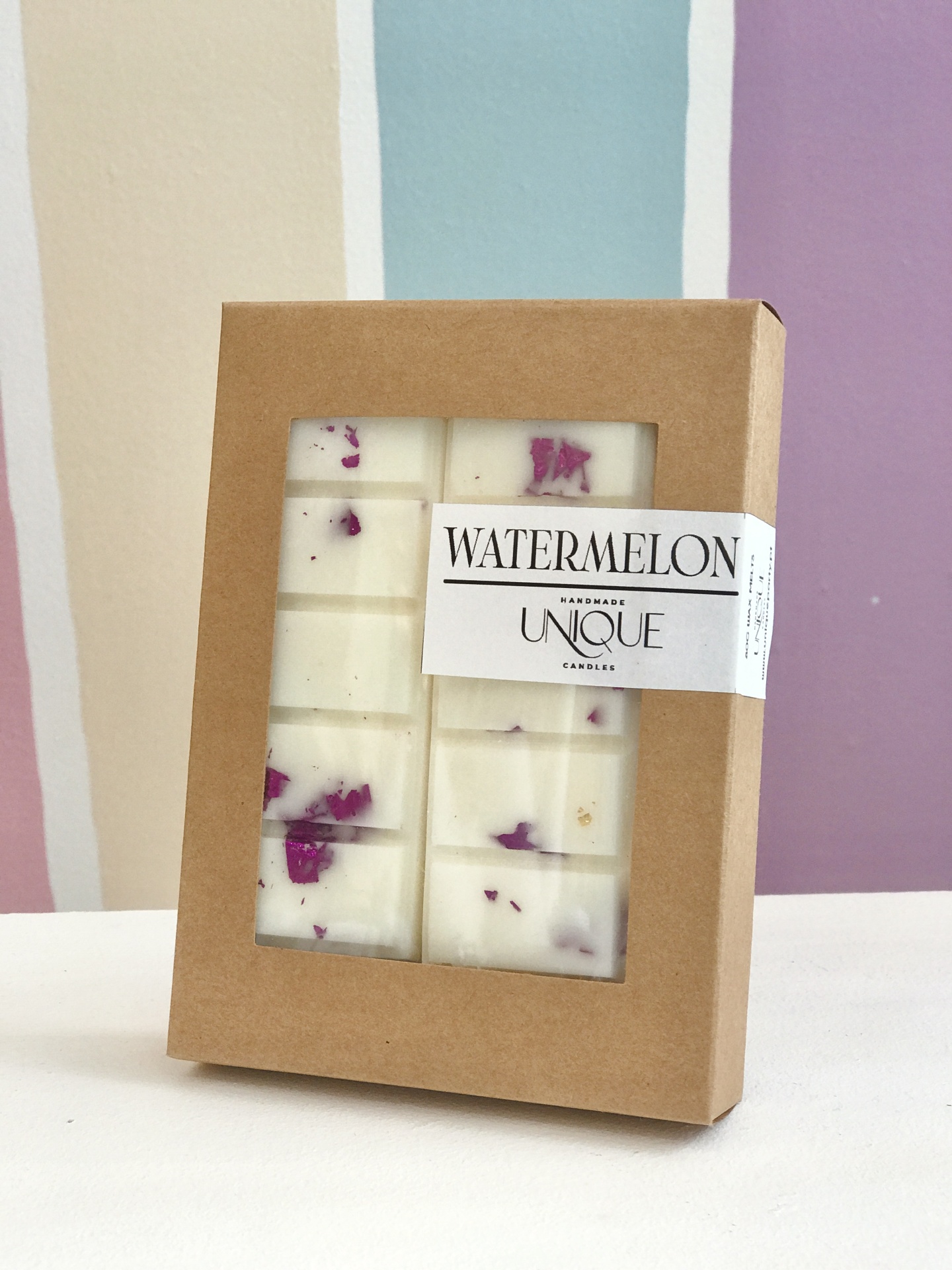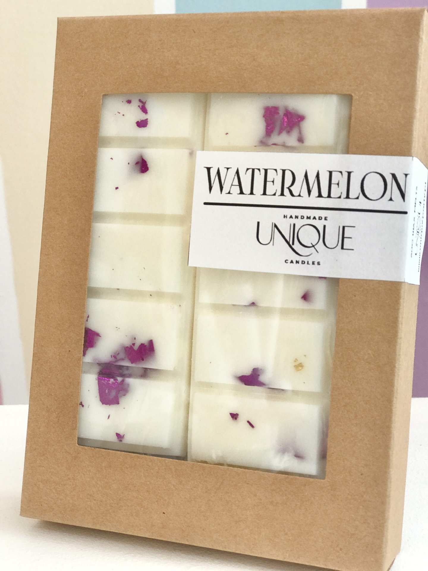 Os wax melts da Unique Candles são feitos manualmente e de forma artesanal, usando cera de soja com detalhes cuidadosos.