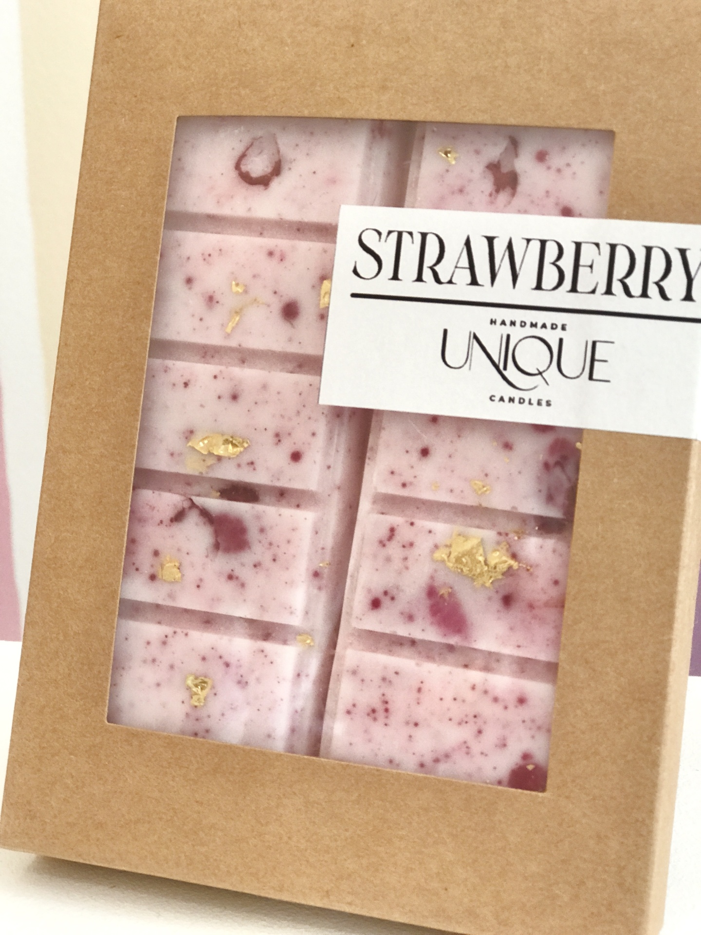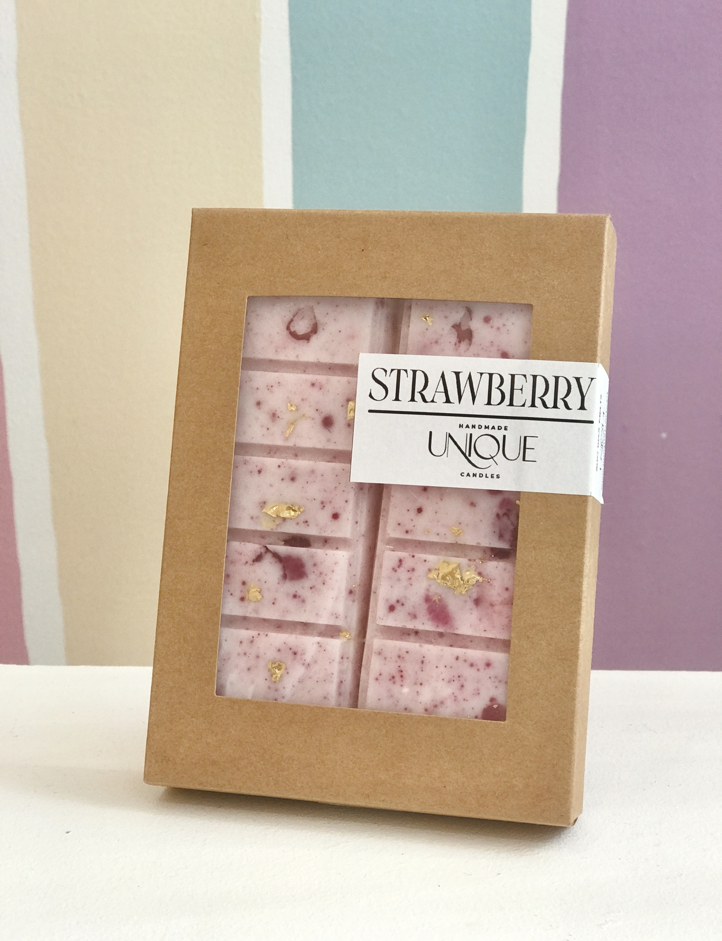 Os wax melts da Unique Candles são feitos manualmente e de forma artesanal, usando cera de soja com detalhes cuidadosos.