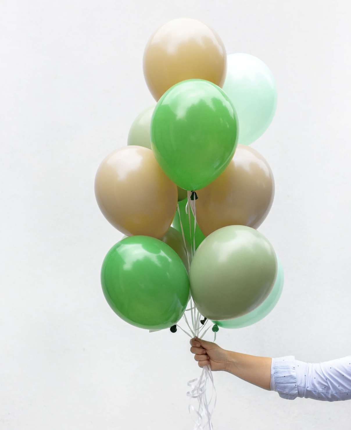 O pack Woodland traz 12 balões de látex lisos e cromados (27/30cm) em tons inspirados na floresta.